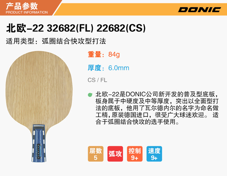 多尼克北欧精选22乒乓球拍底板5层纯木弧圈结合快攻型乒乓底板