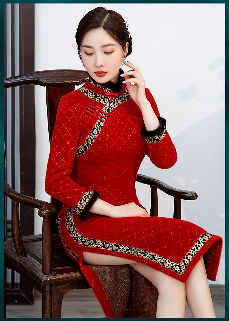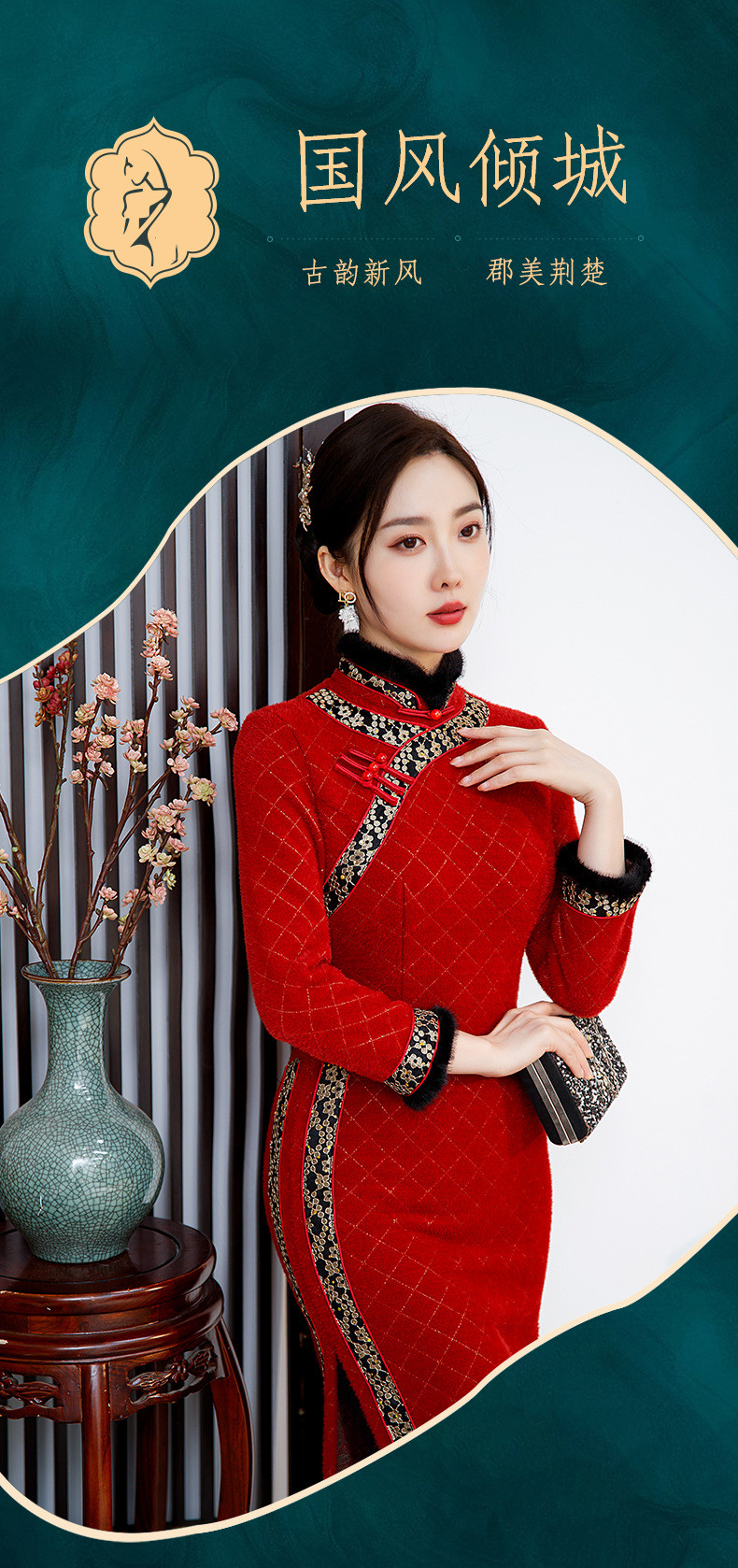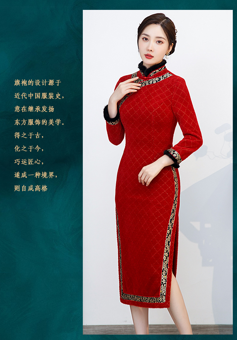 TZW-中国风立领走秀礼服款长款毛领边旗袍 ST-C2177