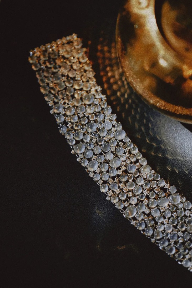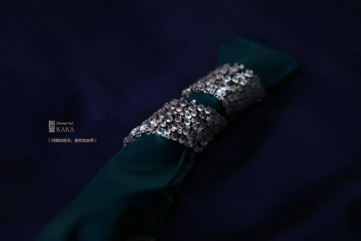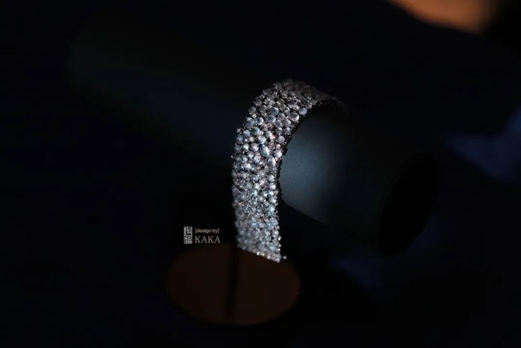 采用上百颗玻璃种翡翠强荧光白蛋,上百颗大大小小的钻石,啊,有点像我在云南大理高原的山顶夜晚,看见的那条银河,深蓝色的天幕里,星座清晰可辨,星星静谧而闪烁。可以卷绕,可以折叠,可以平铺直叙,更可以蜿蜒曲折。而一件大珠宝,就足以使腕间璀璨,其他装扮大可以隐退些,