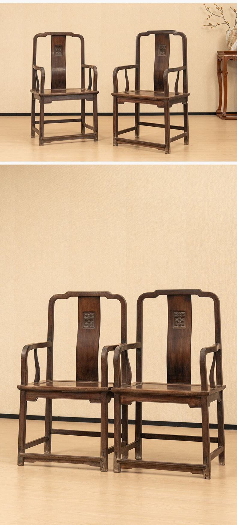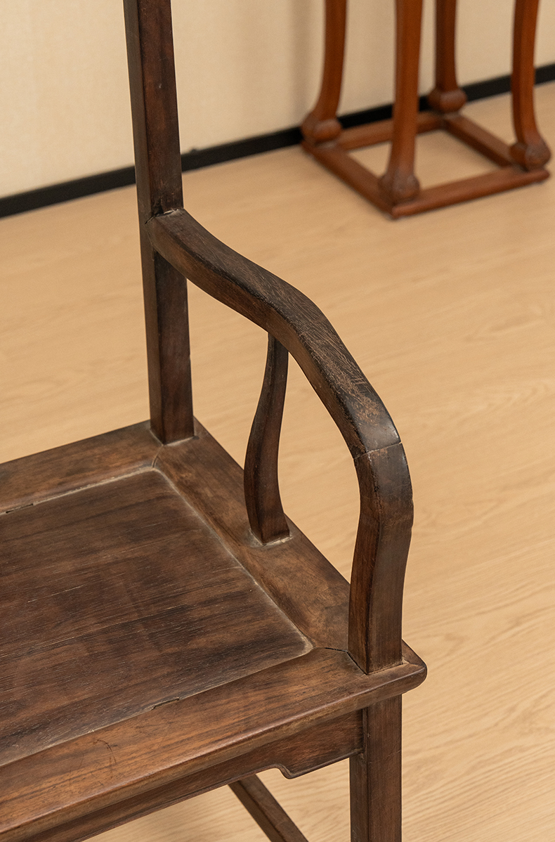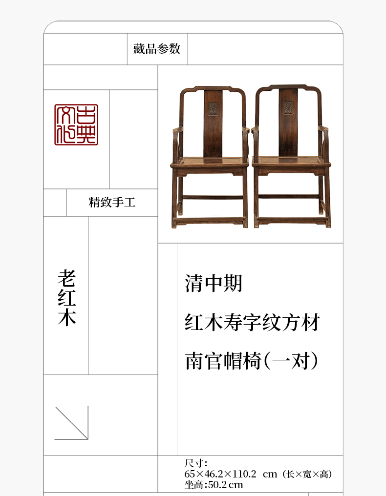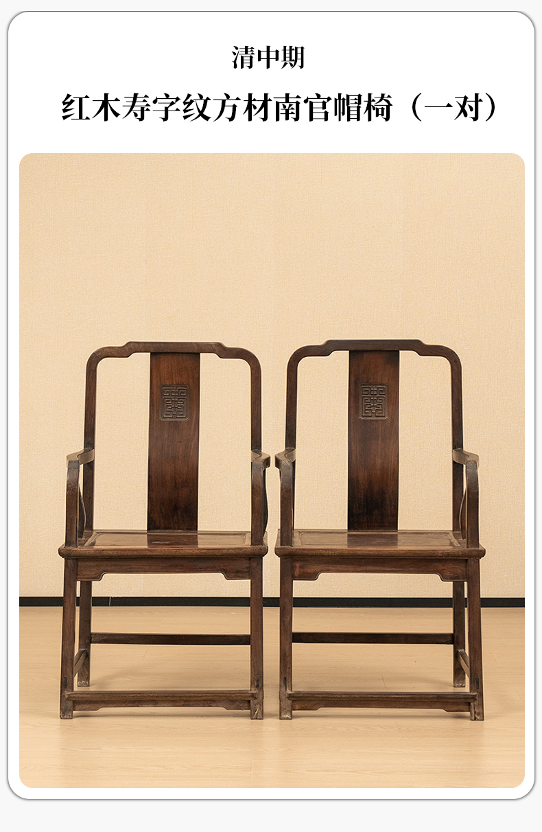 清中期 红木寿字纹方材南官帽椅(一对)
