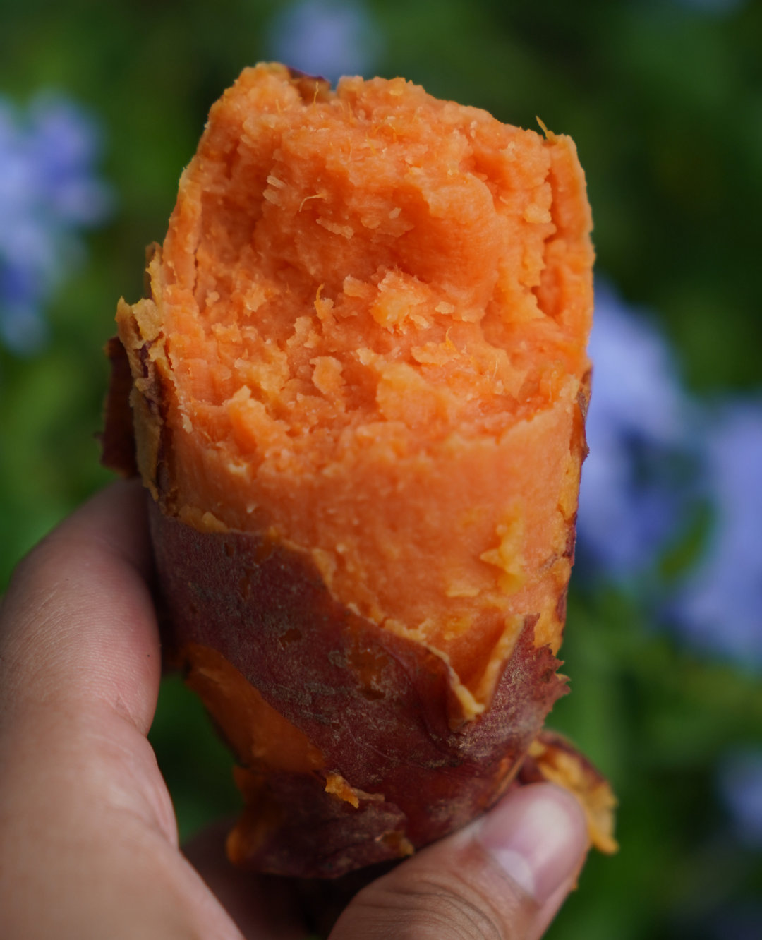 西瓜红表皮呈紫红色,肉色为桔红色;基本上没有筋没丝,肉稍瓷实,很耐储存。口感软糯适中,甜度也适中。适合烤和蒸,西瓜红烤完后是偏粉糯的。