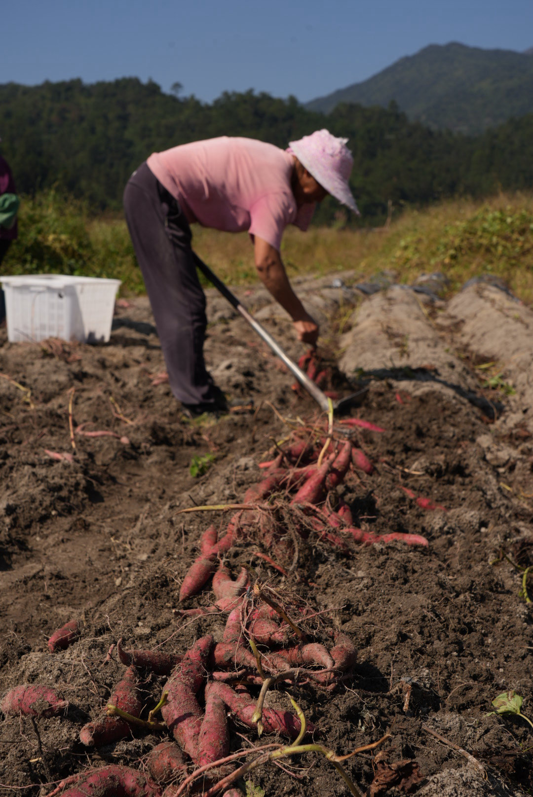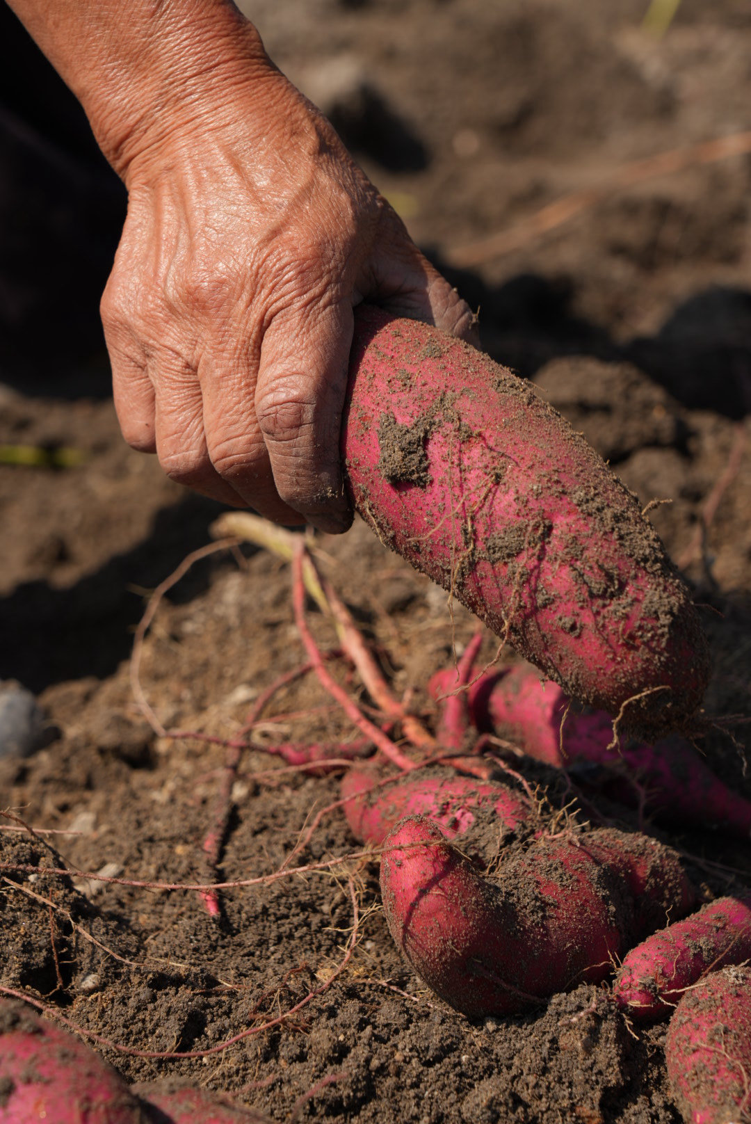 红薯是韶关基地后开荒出来的第一块地种下去的第一个作物,因为土壤属于沙土,透气透水性好,十分适合种植根茎类的作物,这个地块已经撂荒十多年,土壤有机质含量十分丰富,土壤颜色为黑灰色,种出来的红薯很是粉糯。