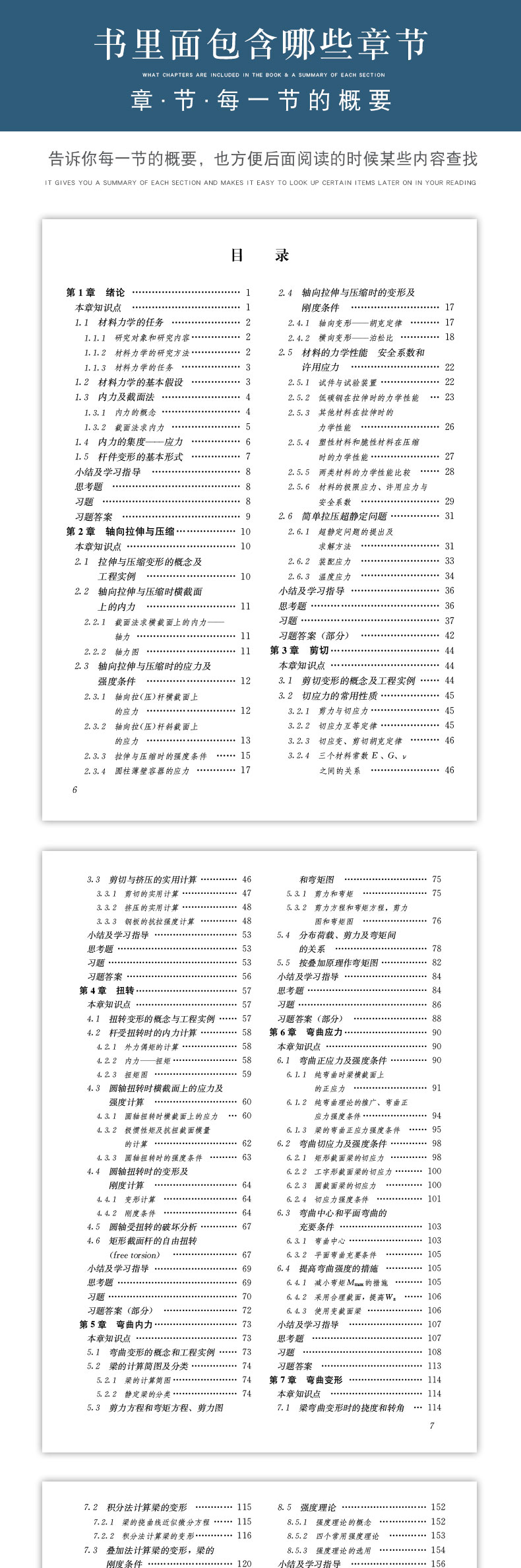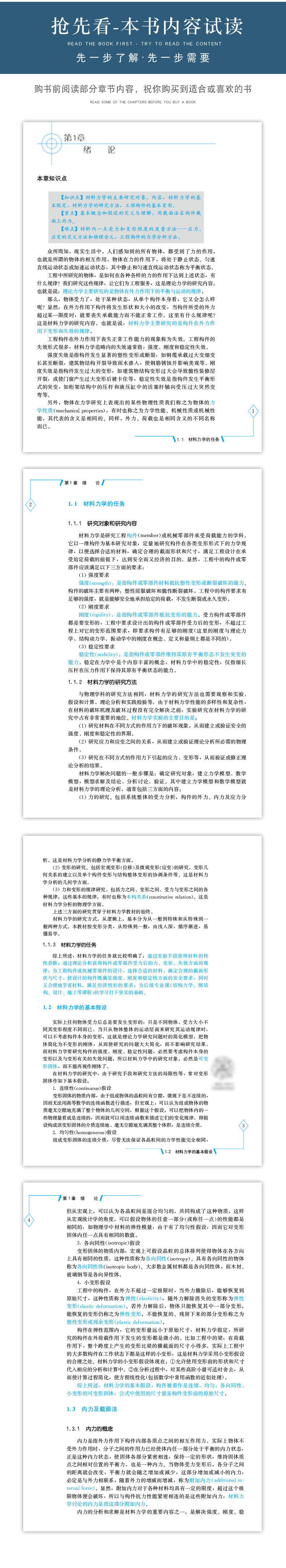 本书是高等学校土木工程专业教学指导委员会制定的“土木工程指导性专业规范”配套的力学类教材之一。按照教材编审委员的要求,结合土木工程专业特点,本书既保留了国内原材料力学教材的,从特殊到一般,由浅入深,循序渐进,易学易懂的特点,又增加了实验与实践教学;既注重了知识体系的完整性和实用性,又突出了大量的工程实际的基础训练习题。本书针对大土木工程的特点,在对基础理论知识的理解和掌握的基础上,突出工程实践能力与创新意识的培养,体现时代特征。全书共分11章,主要内容包括轴向拉伸与压缩、剪切、扭转、弯曲内力、应力、变形、平面应力状态、强度理论、组合变形、压杆稳定、能量法等。