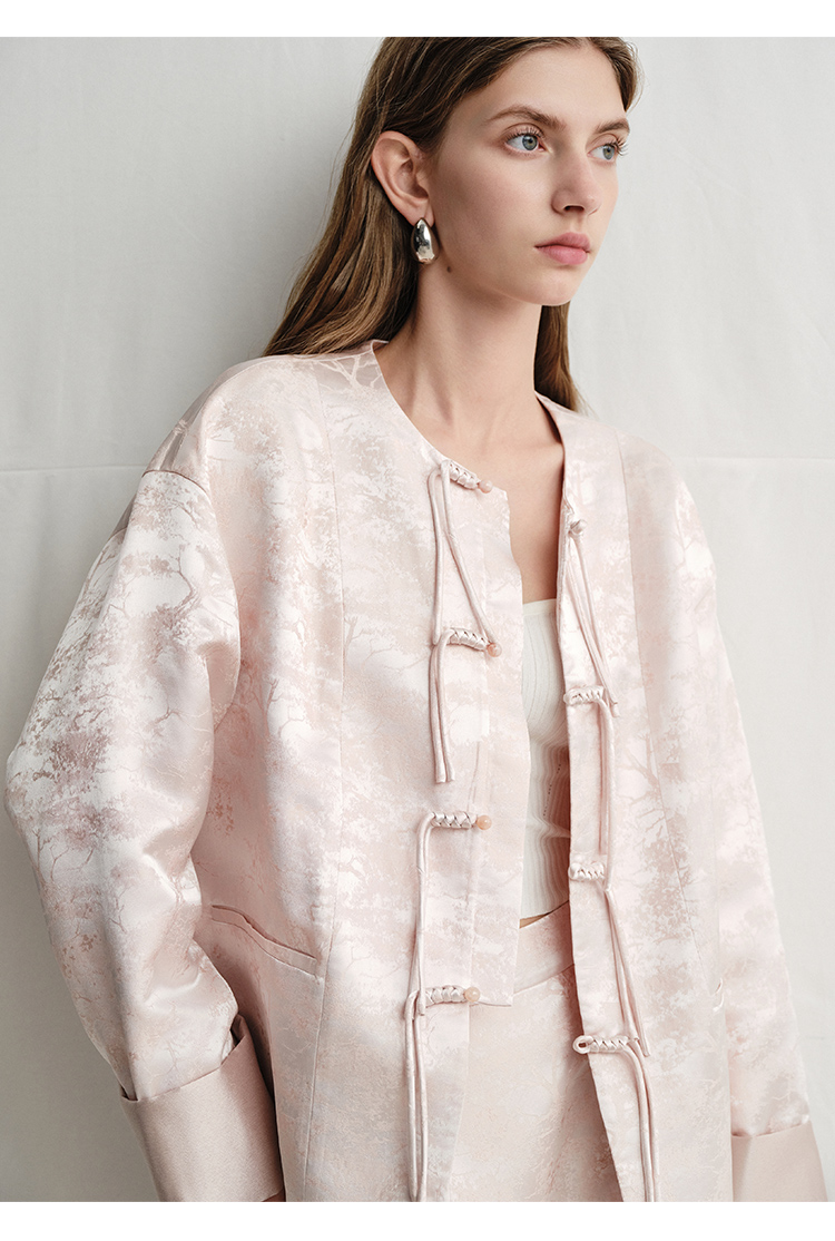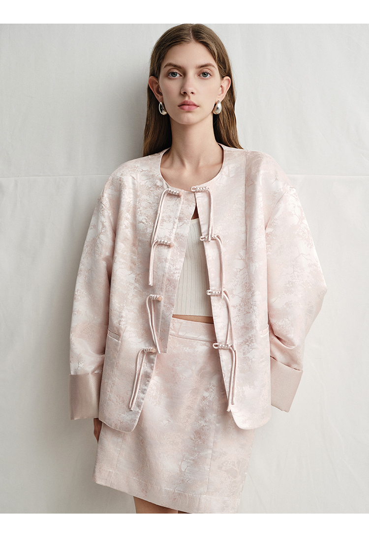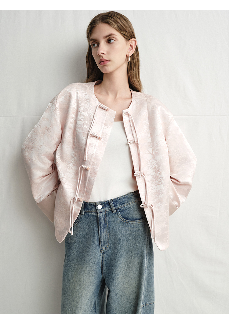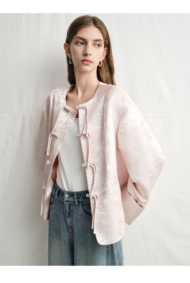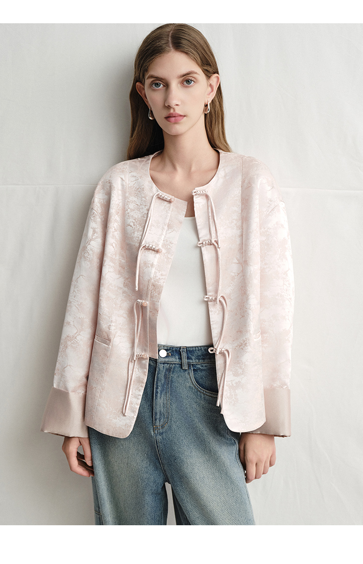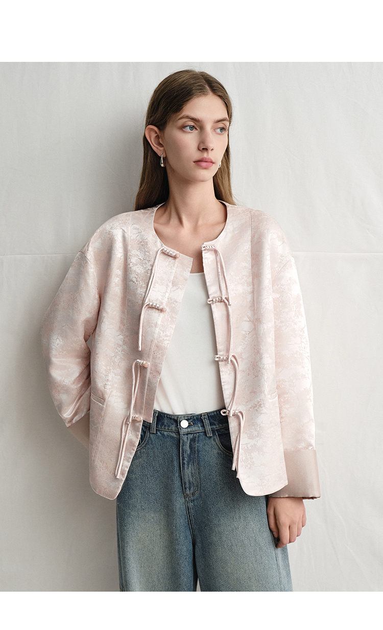 VIMAGE纬漫纪浅粉色新中式盘扣圆领直筒舒适短外套2025春季新款V2303903