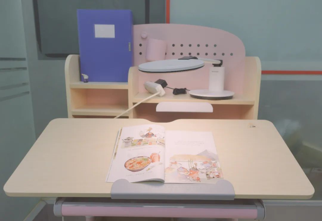 假如家里是学习桌,桌板可抬起变换角度,方便绘画、阅读等。此时,松下的台灯可以挪到书架上。