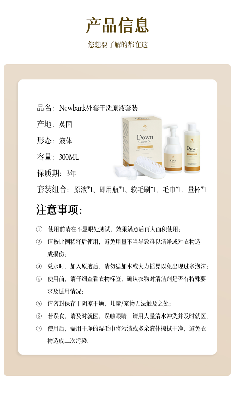英国进口【Newbark 羽绒服干洗剂(外套干洗原液套装)】高浓缩清洁原液 小分子去渍技术 速干免水洗 中性配方 防串色不留痕护衣