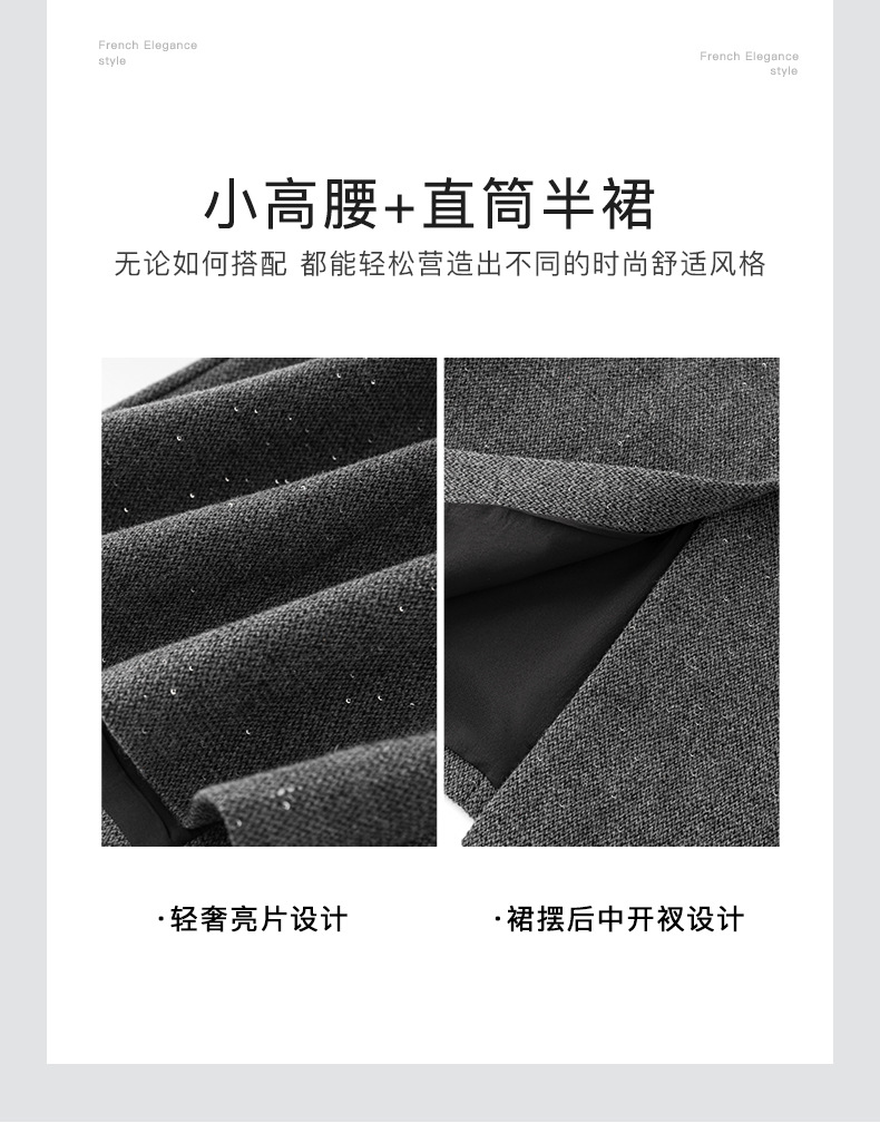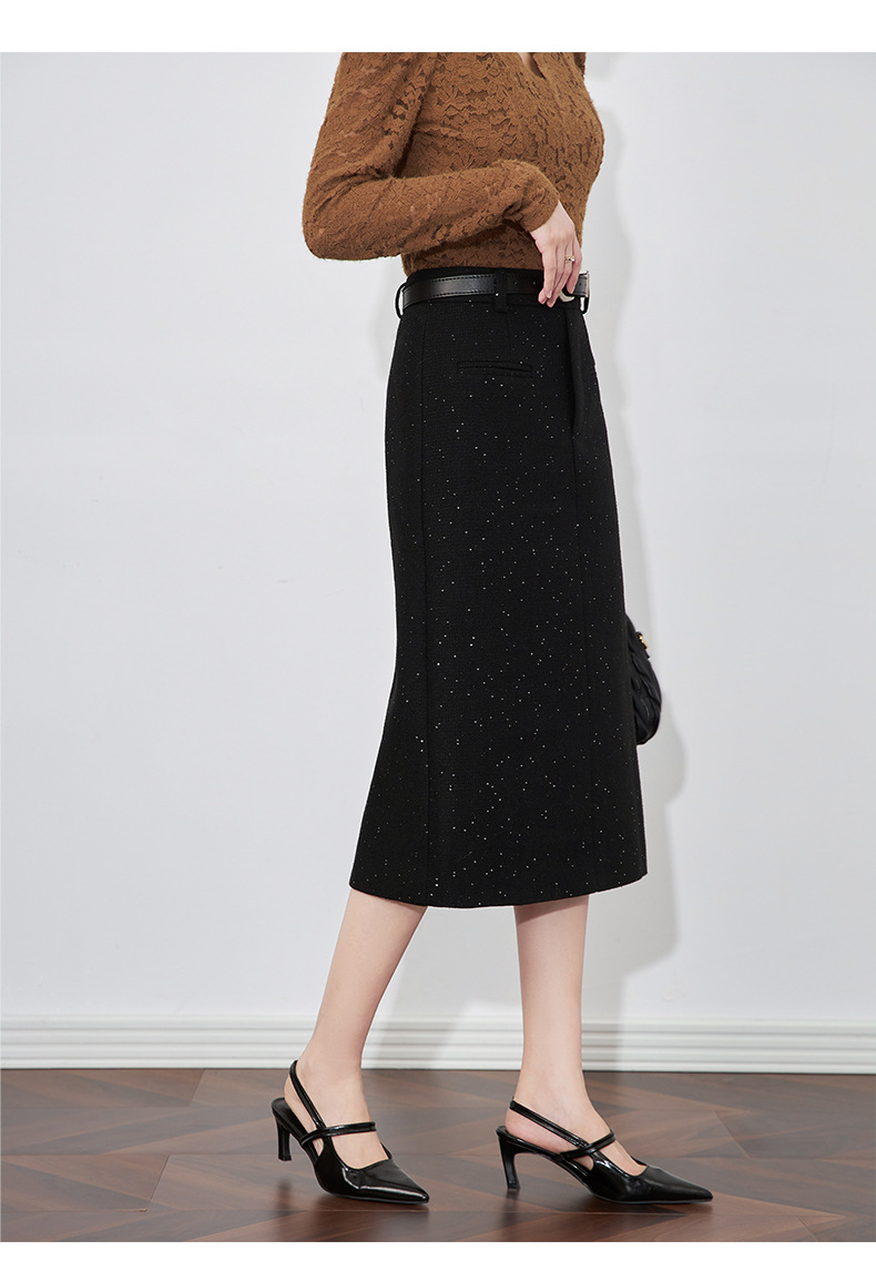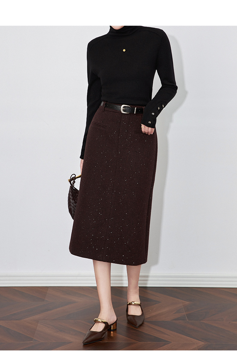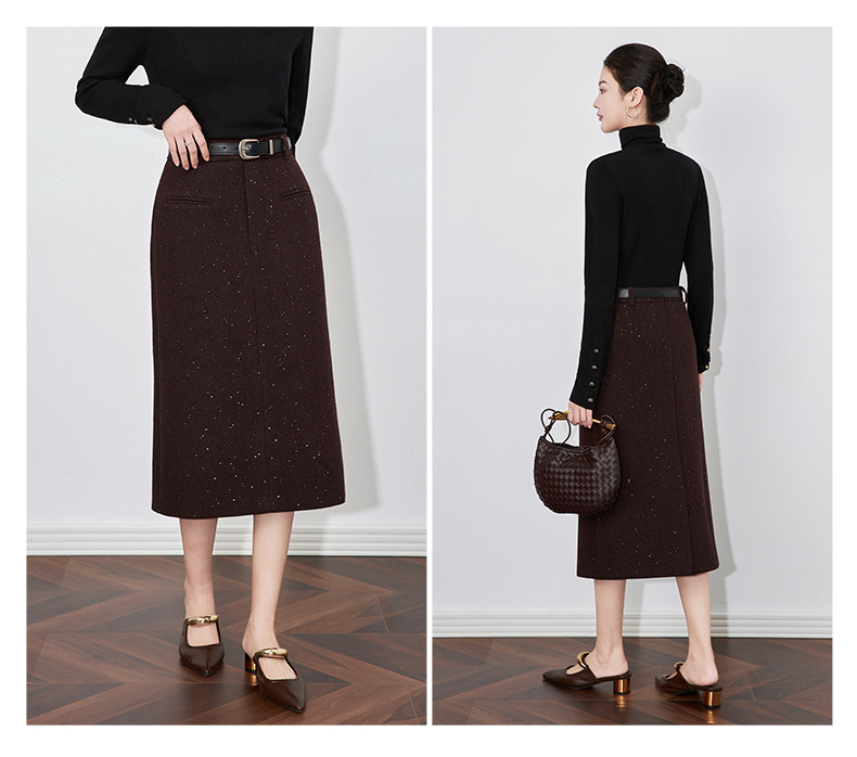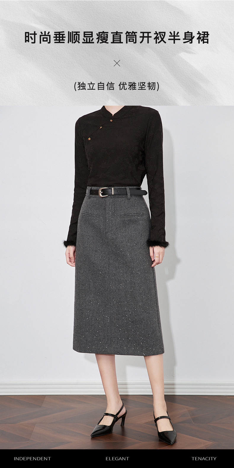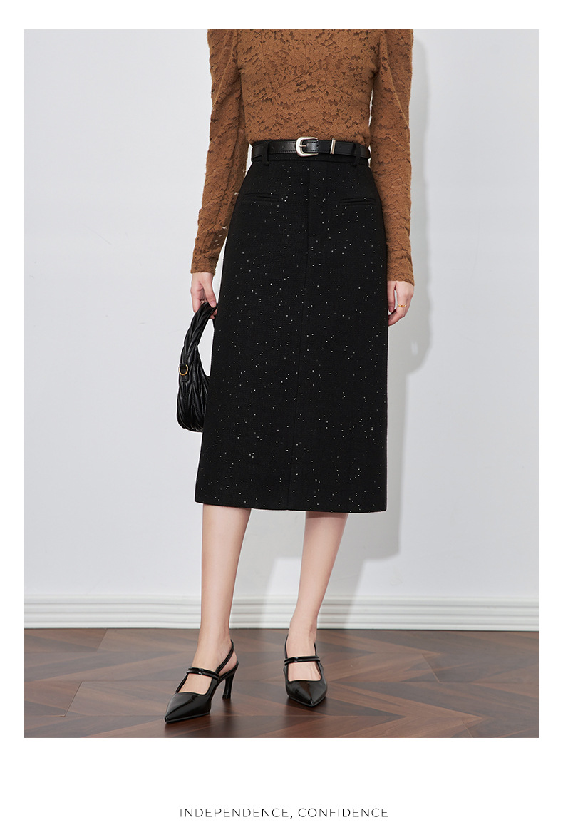 【高货wl】全新升级【铂金会员220/天猫299/差价79】(01622) 洛诗琳羊毛混纺亮片粗呢通勤显瘦直筒高腰包臀后开衩半裙