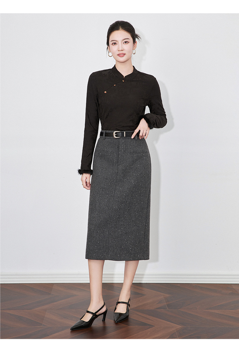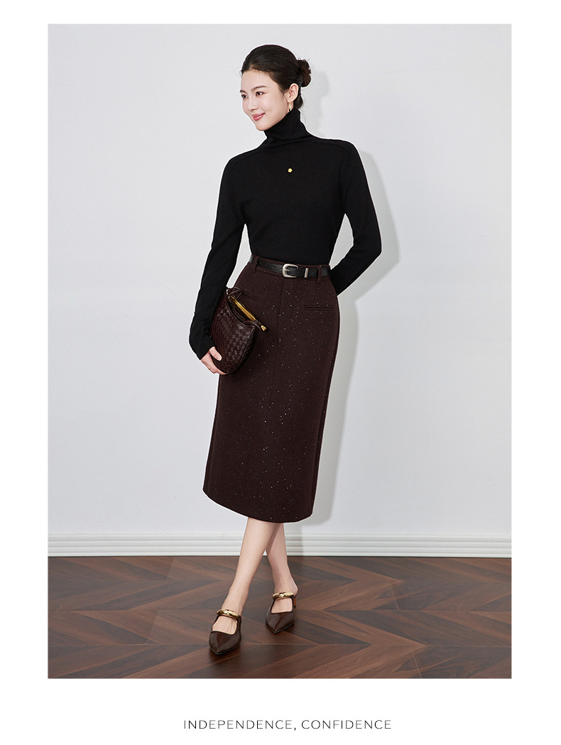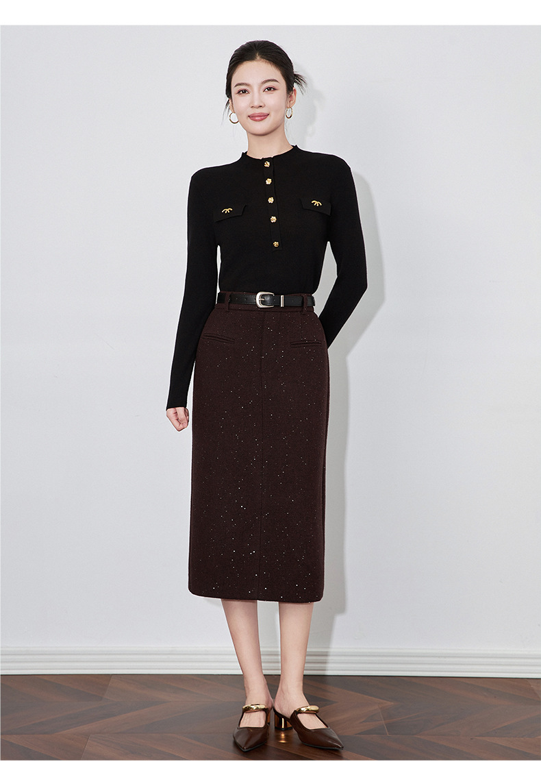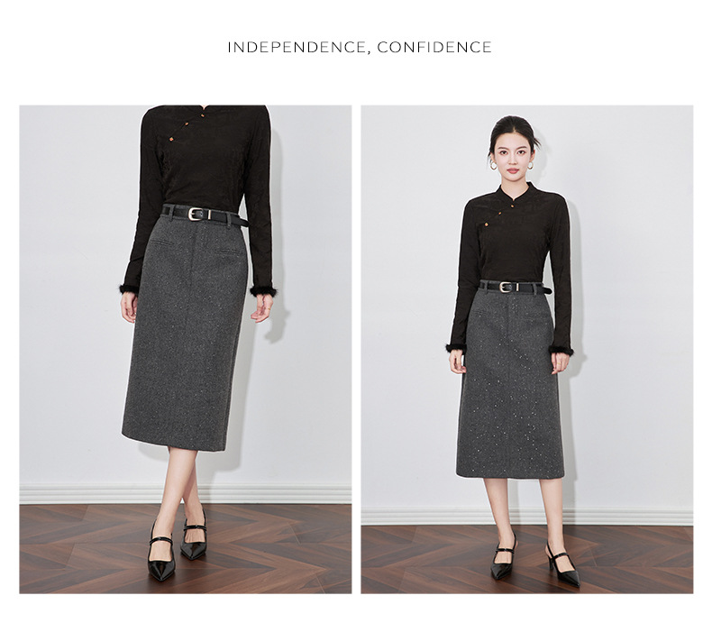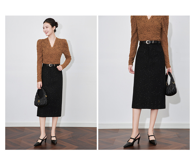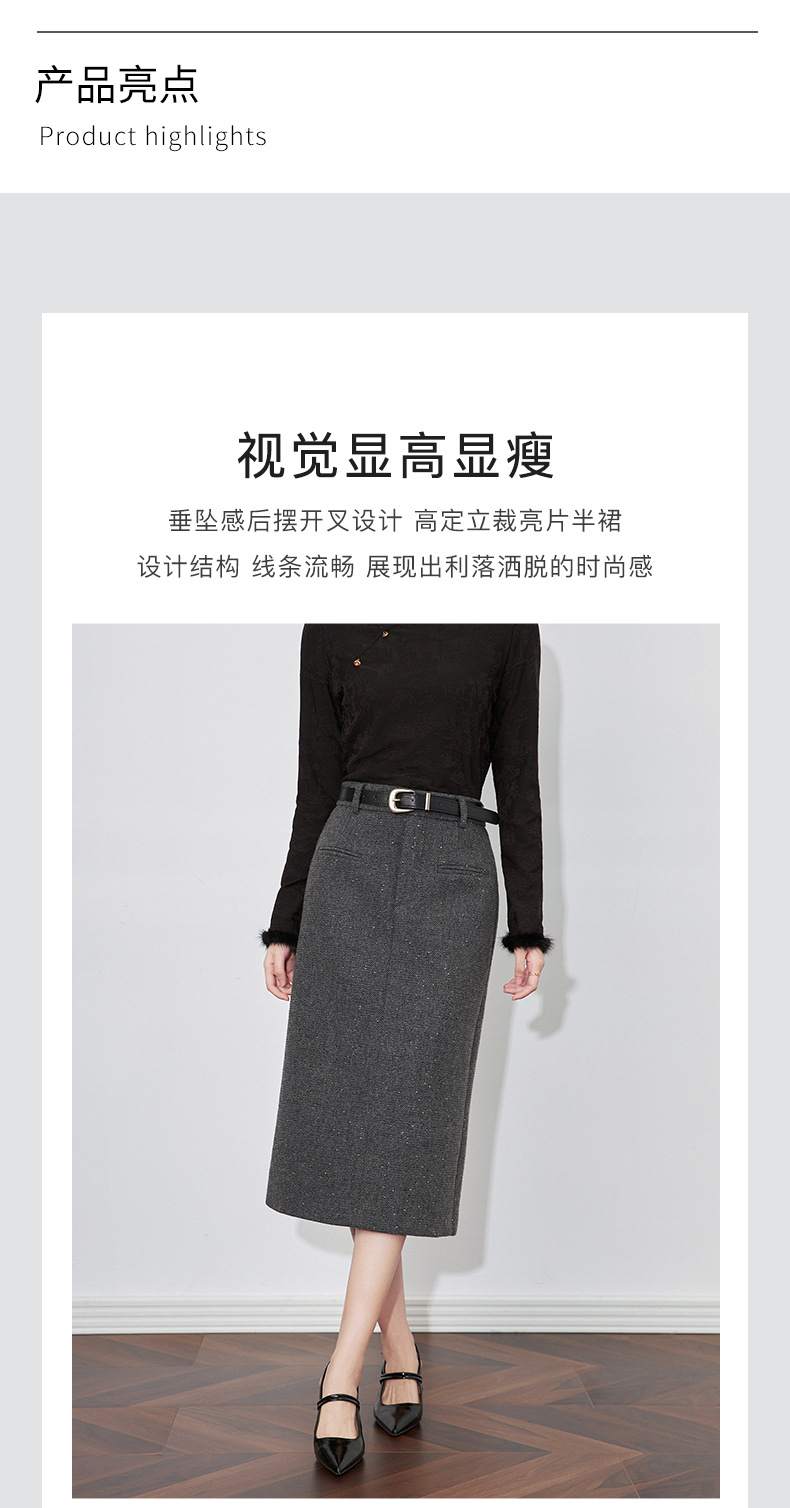 【高货wl】全新升级【铂金会员220/天猫299/差价79】(01622) 洛诗琳羊毛混纺亮片粗呢通勤显瘦直筒高腰包臀后开衩半裙