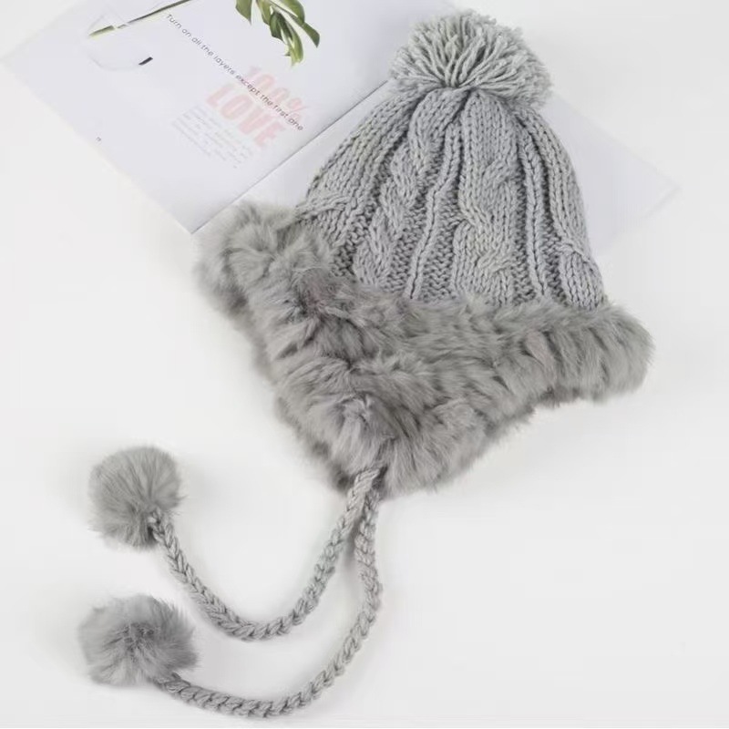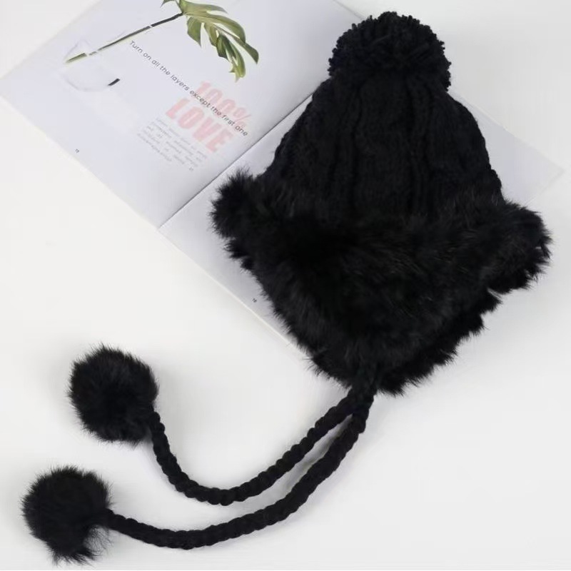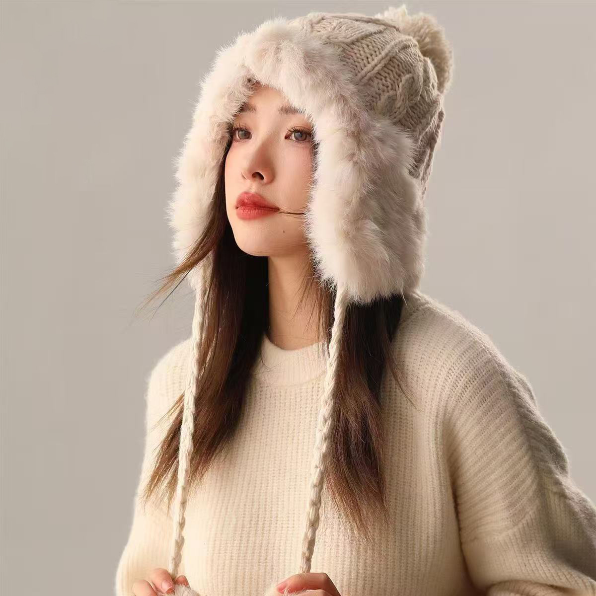 【甜妹必备!韩系暖冬】秋冬韩版百搭显脸小雷锋帽女内衬加绒兔毛护耳帽保暖针织毛线帽子。hb