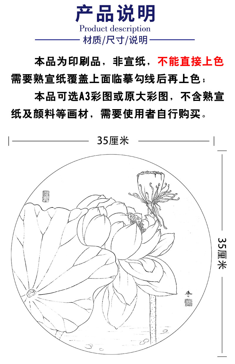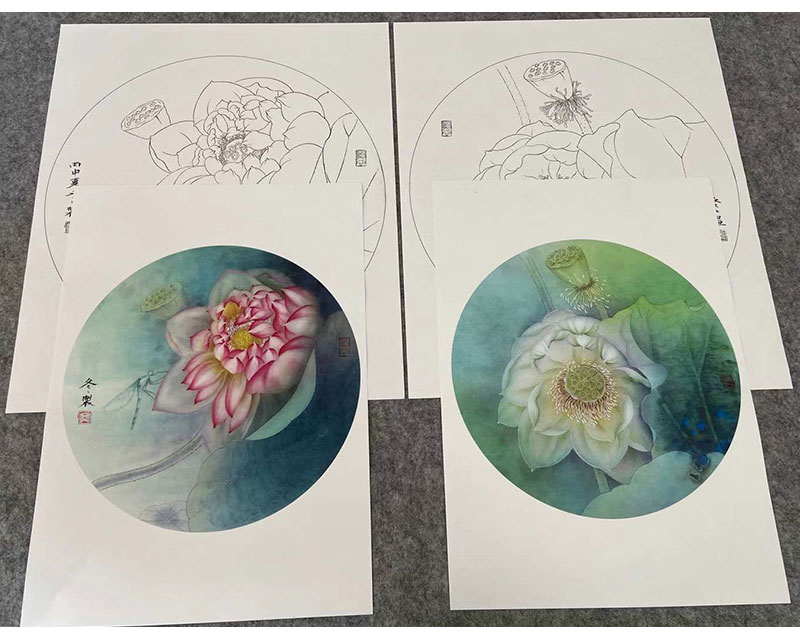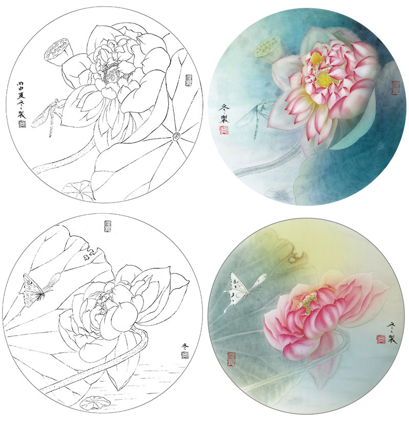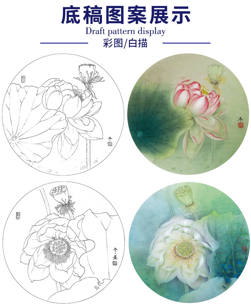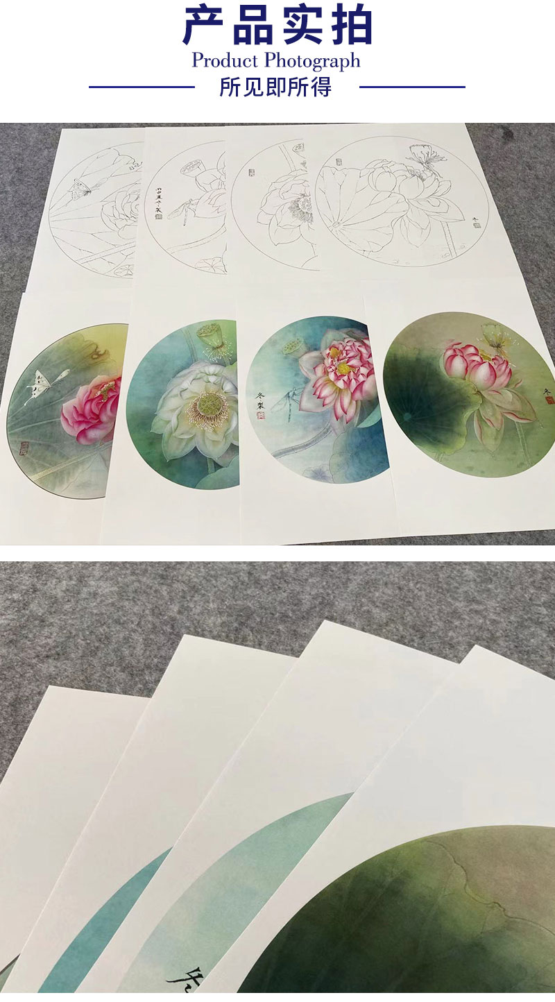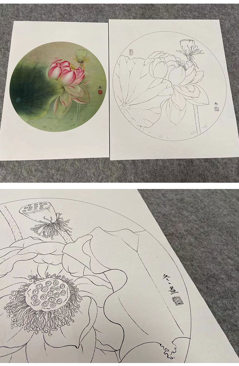 杨冬冬工笔画白描底稿荷花蝴蝶一套四幅初学者尺寸35*35厘米TY03
