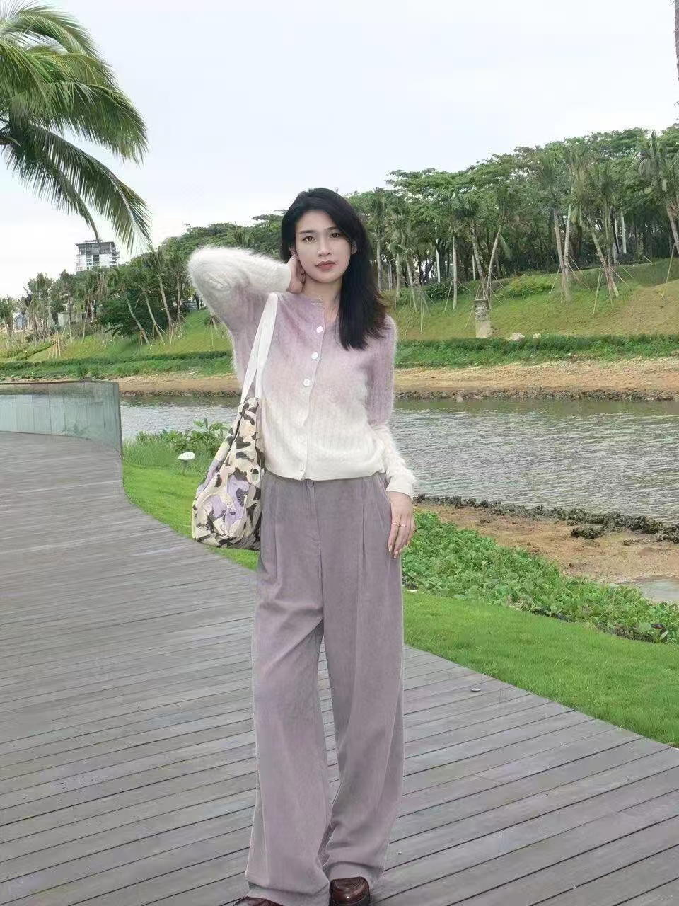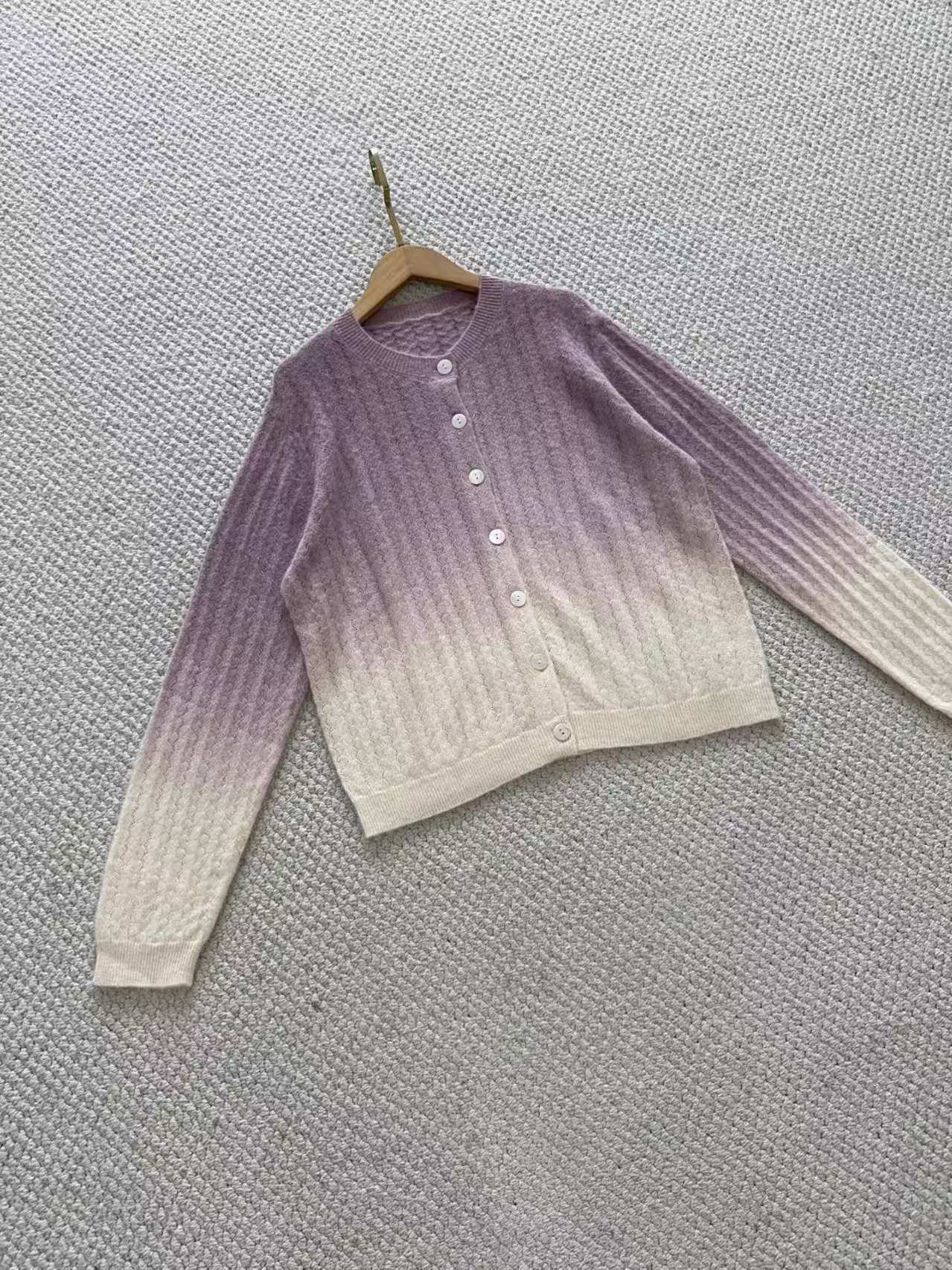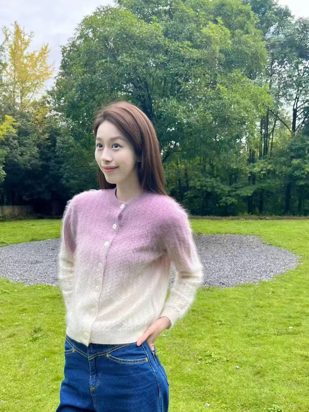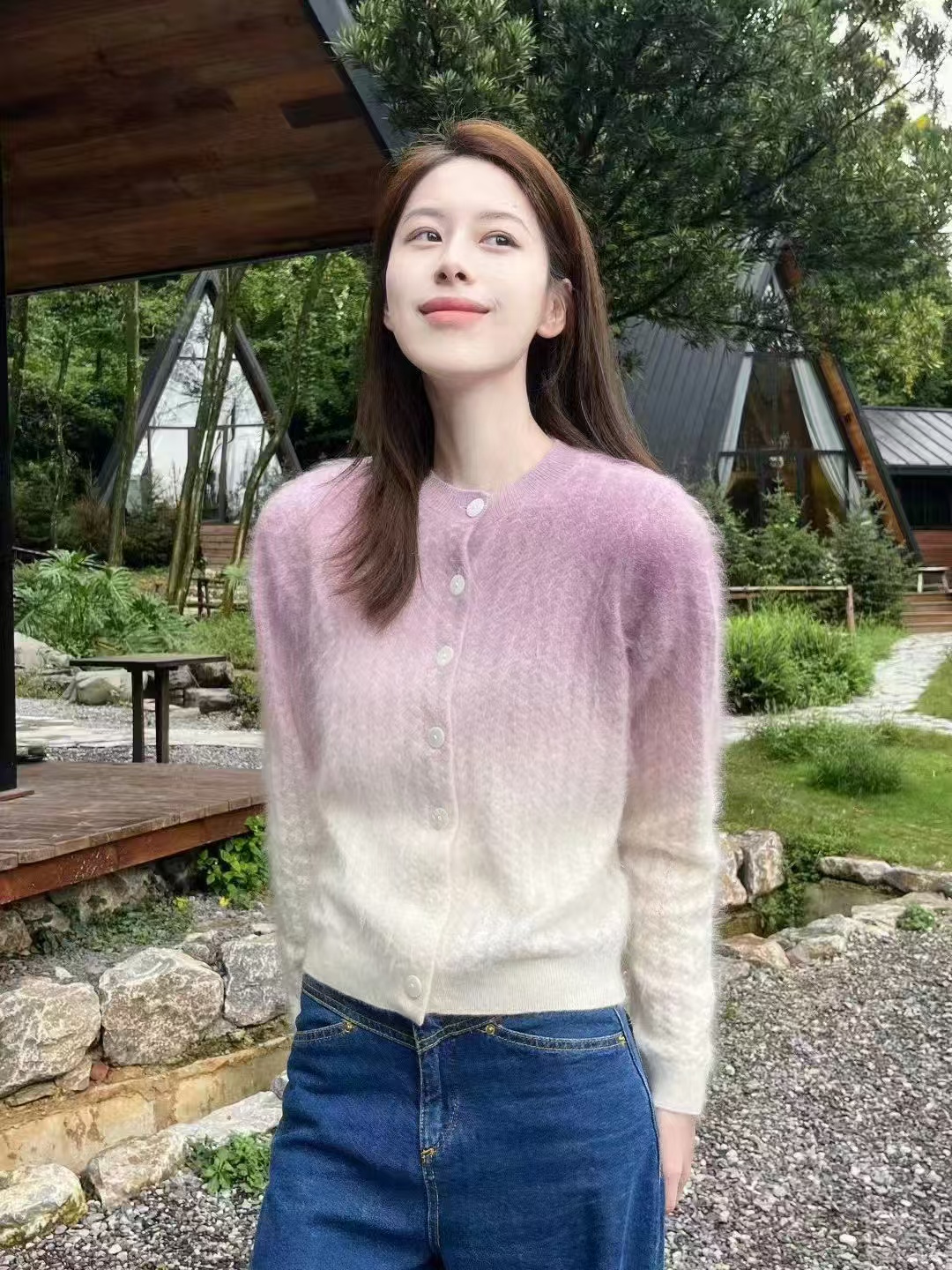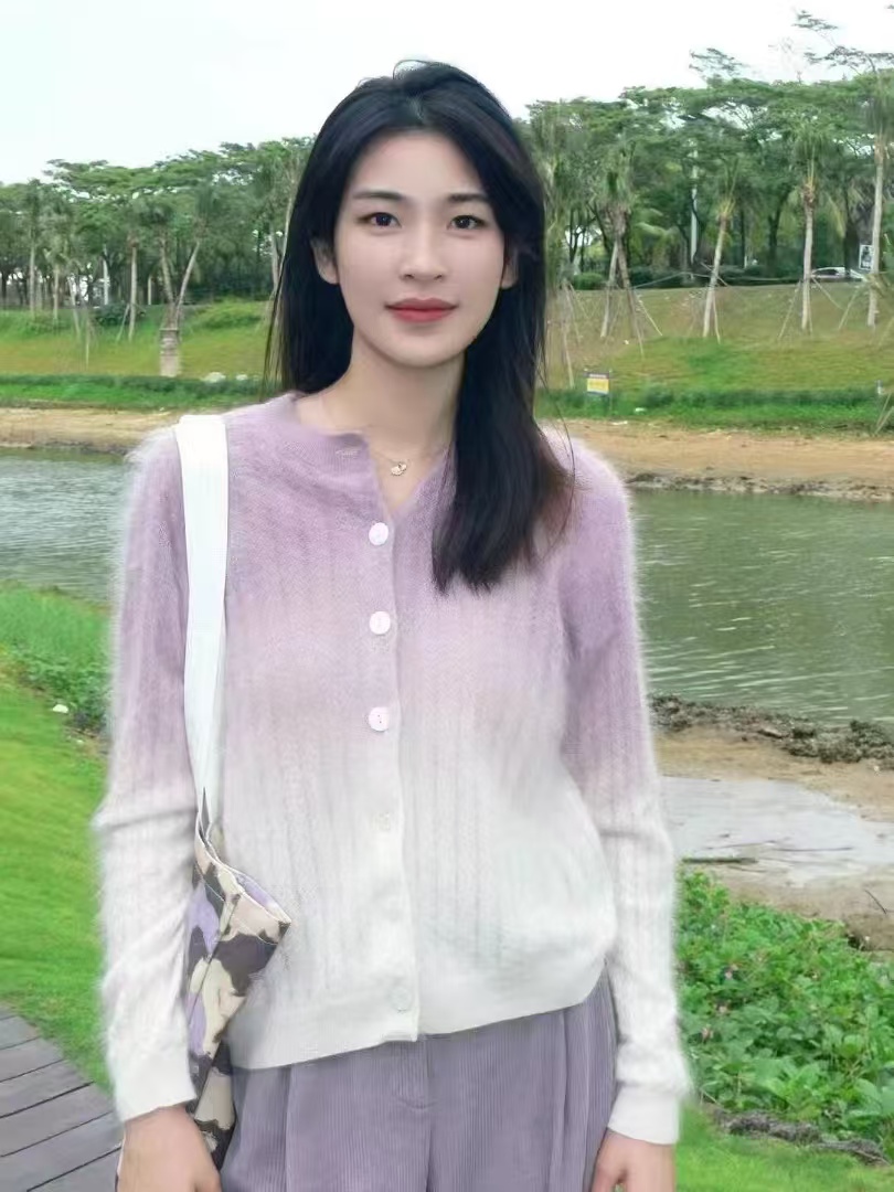 ba*紫色羊毛针织开衫,这款渐变马海毛开衫 是秋日穿搭的氛围作弊器,从淡紫到米白的晕染过渡 像把莫奈的调色盘穿在身上 自带柔光滤镜,细腻马海毛触感软乎乎 贴身穿也无’负担,圆领单排扣设计 风格百搭 可单穿可叠搭。