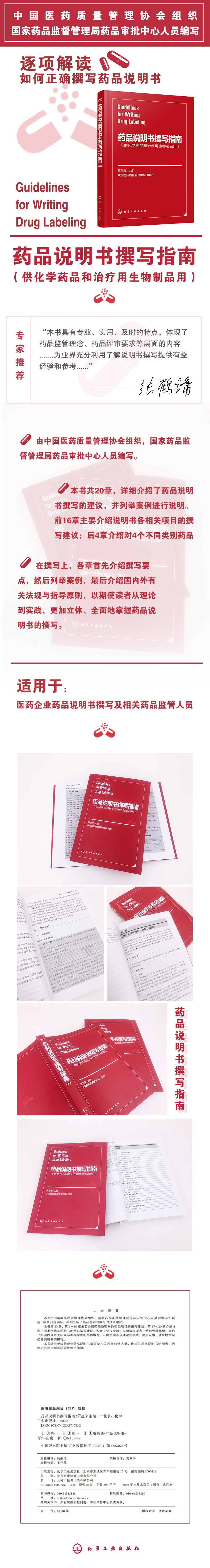 《药品说明书撰写指南》由中国医药质量管理协会组织,一线药审人员编写。本书共20章,详细介绍了药品说明书撰写的建议,并列举案例进行说明。前16章介绍说明书各相关项目的撰写建议;后4章介绍对4个不同类别药物的特殊撰写建议。在撰写上,各章首先介绍撰写要点,包括撰写的主要内容、格式和注意事项;然后列举说明书案例,指出存在的问题,列举正确的撰写案例,使读者从正反两方面认识撰写要点;zui后介绍我国和欧美有关法规与指导原则,扩大读者视野,从而使读者获取更多的撰写灵感。 《药品说明书撰写指南》适用于医药企业药品说明书撰写、药品注册有关人员。