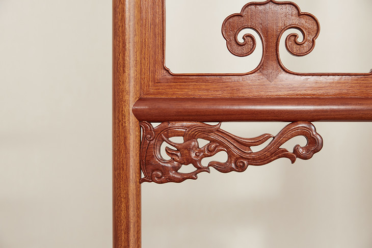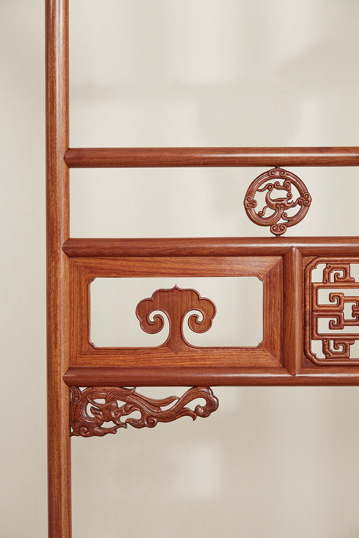 清式螭龙衣帽架,如意云纹自顶部两侧飞天而起,吉祥升腾,中段开光呼应,繁中忽简,吸睛异常,各处牙板、卡子等纹饰均取古螭龙为题材,透雕而成,威而不严,庄而不重,琳琅相协,墩座回纹不断,富贵连绵,会所可陈可藏,家居可用可赏。