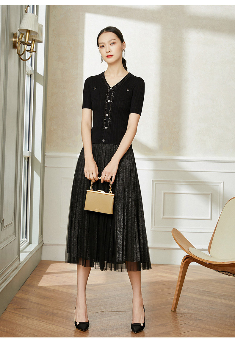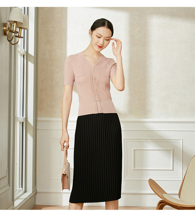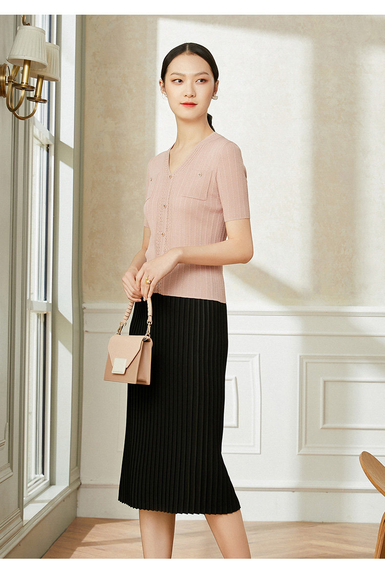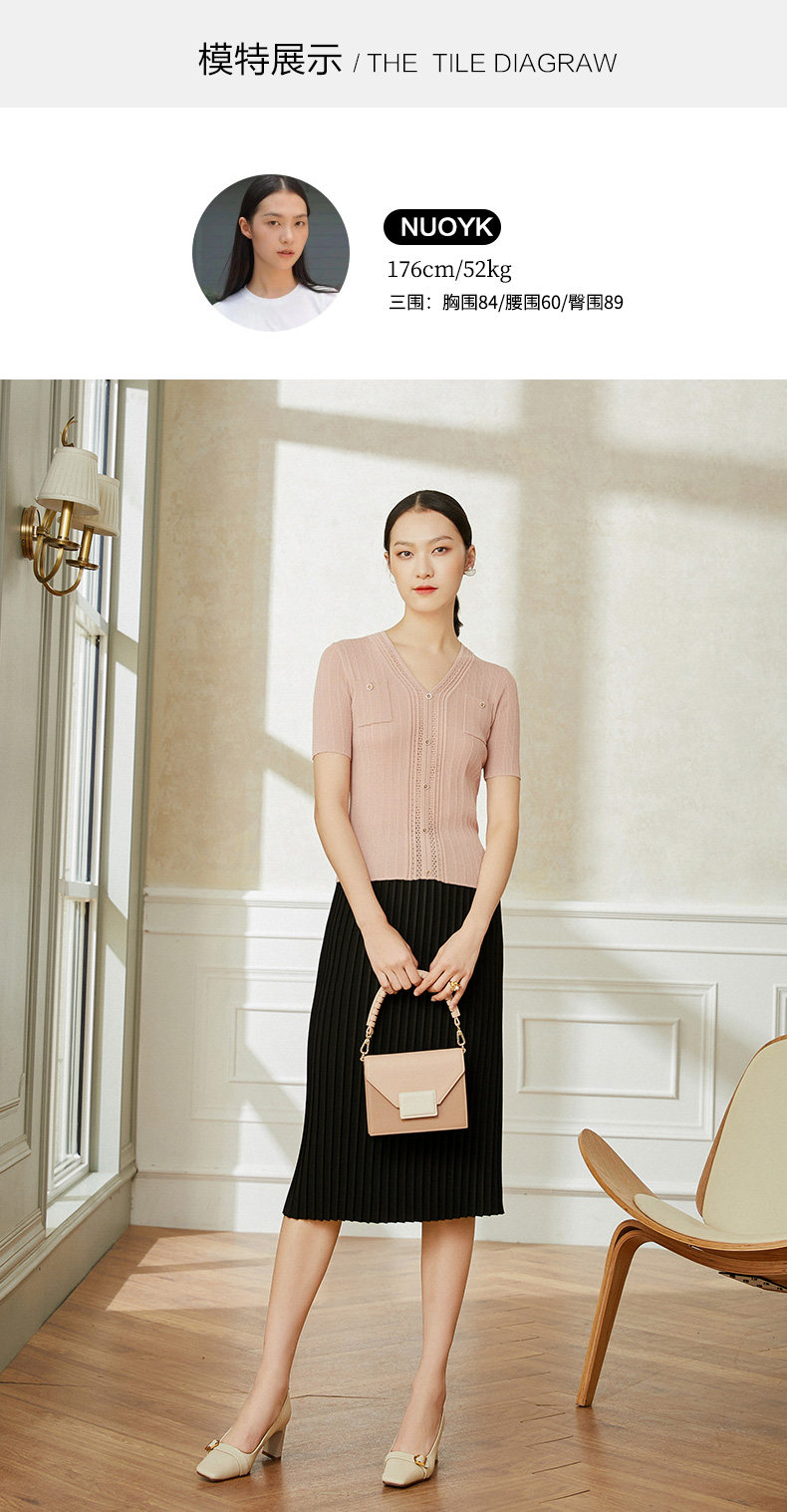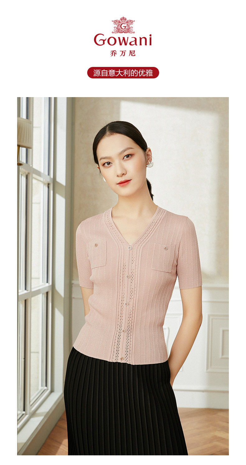 乔万尼早春冰丝针织衫薄款小香风设计感v领修身夏款短袖EI2M818