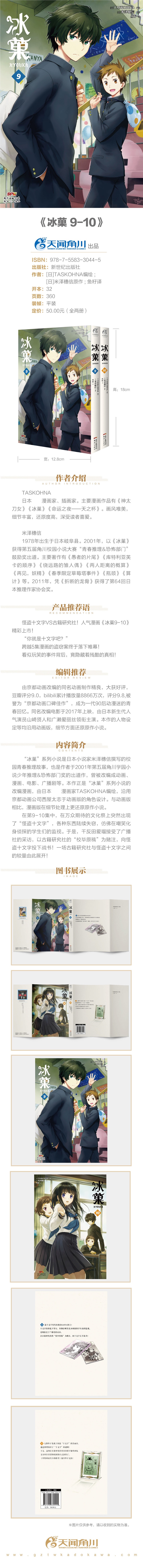 “冰菓”系列小说是日本小说家米泽穗信撰写的校园青春推理故事,也是作者于2001年第五届角川学园小说少年推理&恐怖部门奖的出道作,曾被改编成动画、漫画、电影、广播剧等。本作正是“冰菓”系列小说的改编漫画,由日本漫画家TASKOHNA编绘,沿用京都动画公司西屋太志于动画版的角色设计。与动画版相比,漫画版在细节处理上更还原原作小说。