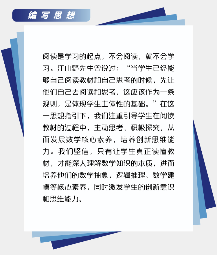 本书依托人教版课标教材为设计基础,通过引导学生先读懂教材,后完成《学习设计》,有效引导学生经历知识的产生、发展及其应用的过程,进而掌握整个知识系统的基本结构。以问题为导向,引导学生一页一页、一章一章地把数学教材读懂读通。经过所在地区各校十五年的反复实践、磨合与修改,实验效果显著。全书十二章,每课时内容从读懂教材、拓展创新、总结提升几方面着手,经过实践探索和研究典例,带领学生深巩固基础,拓展创新知识点的应用。