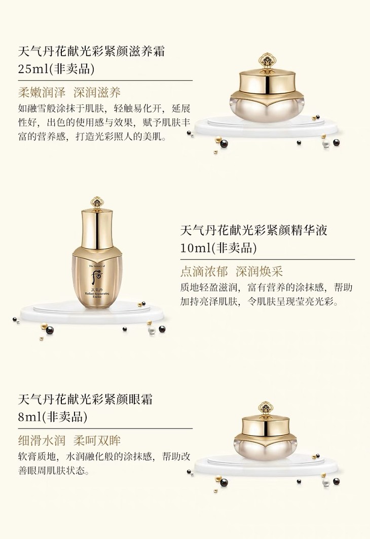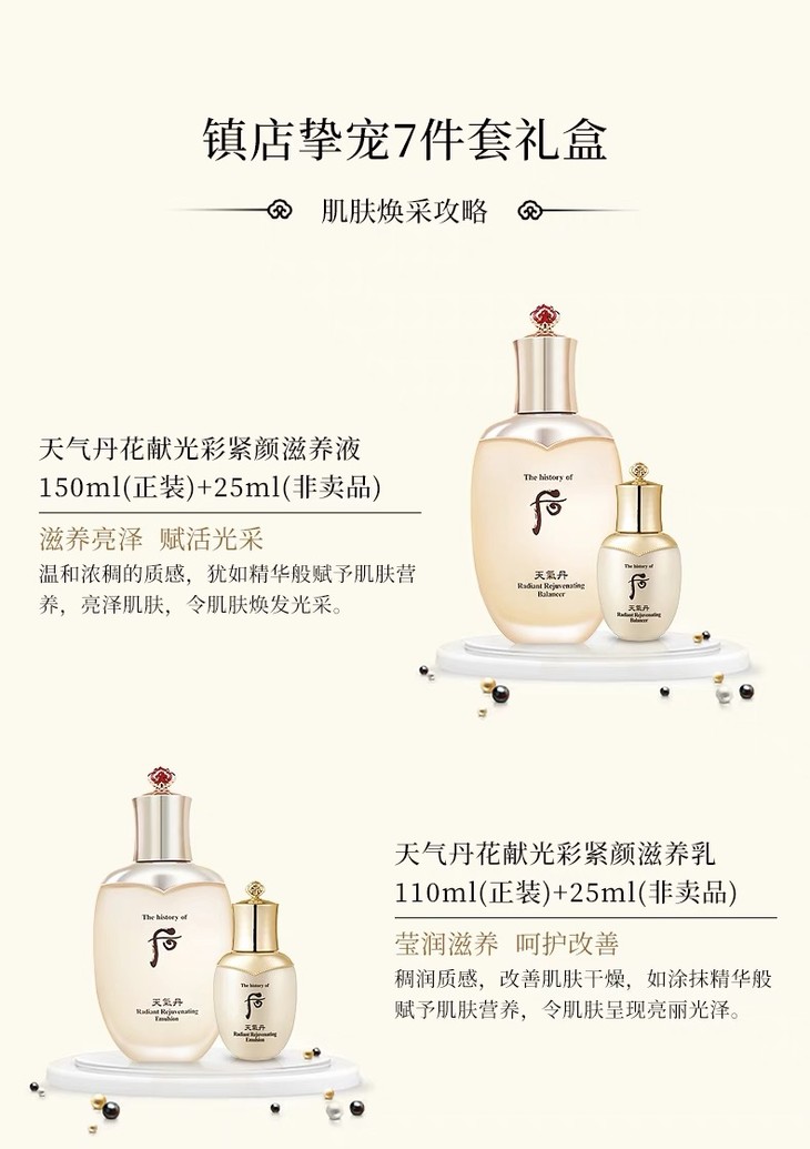 【商品名称】:后天气丹花献光彩紧颜系列礼盒7件套 【商品规格】:滋养液150ml+滋养乳110ml+滋养霜25ml+赠滋养液25ml+滋养乳25ml+紧颜眼霜8ml+紧颜精华10ml。 【包装方式】:盒裝。 【发货时效】:正常72小时内。 【发货地区】:广东/香港。 【配送快递】:四通一达。 【运费说明】:全国包邮,非偏远地区除外。 【注意事项】:避免阳光直射,存放阴凉干燥处。 |