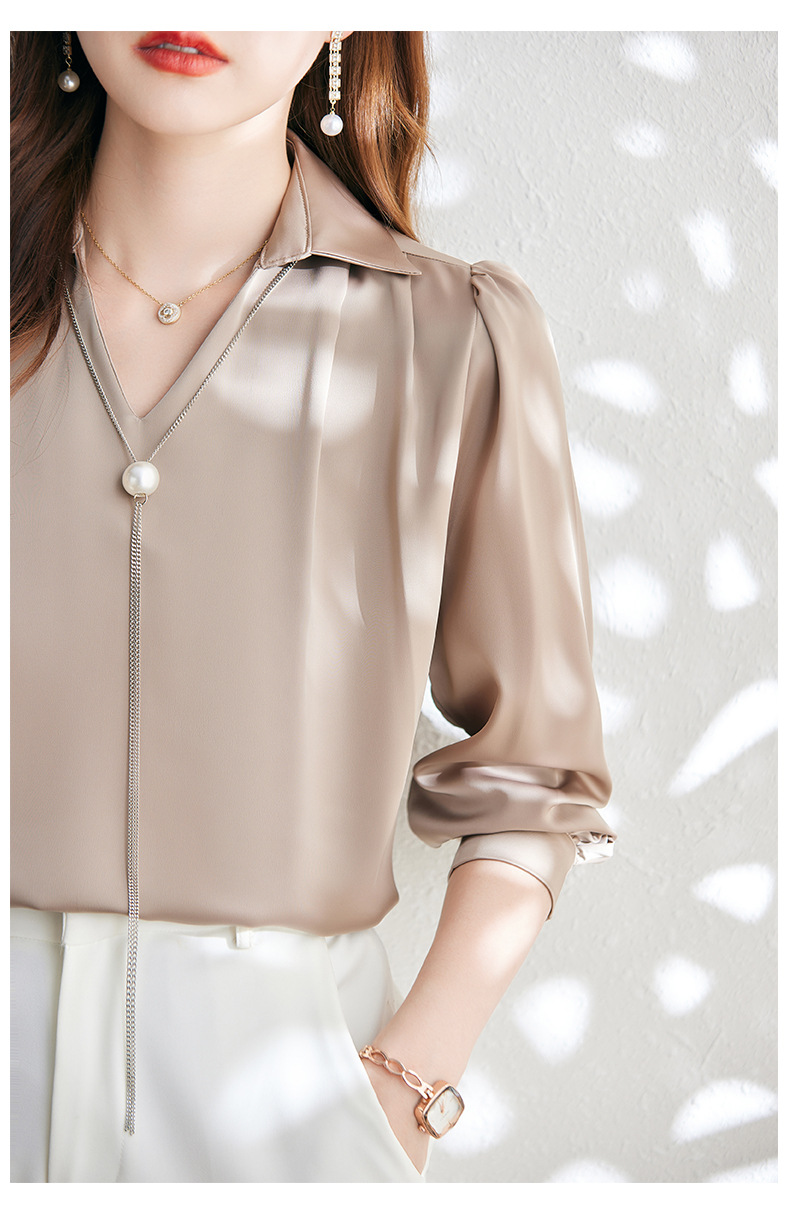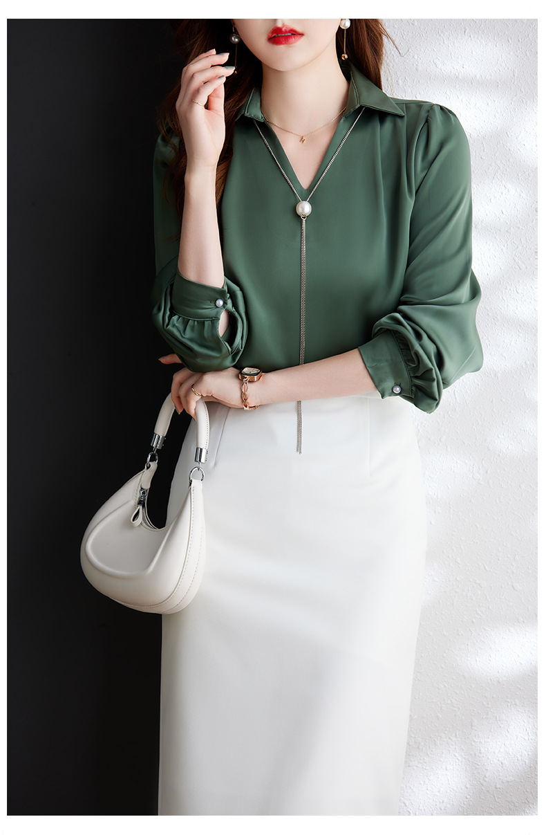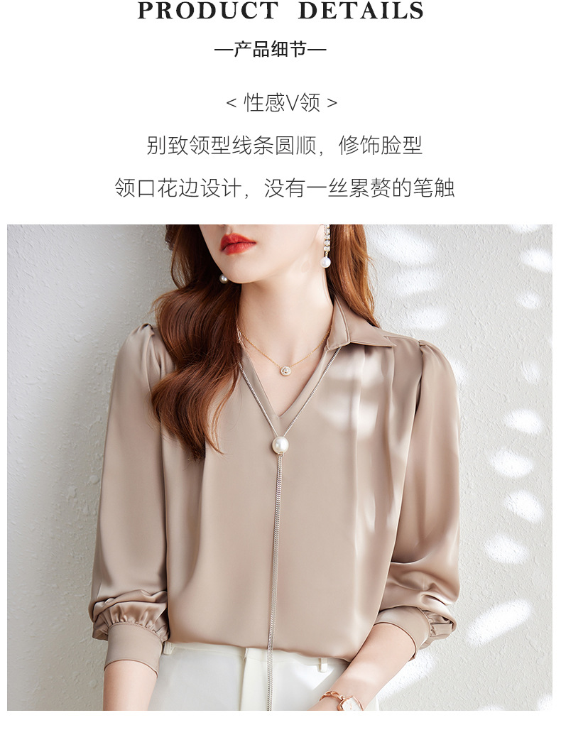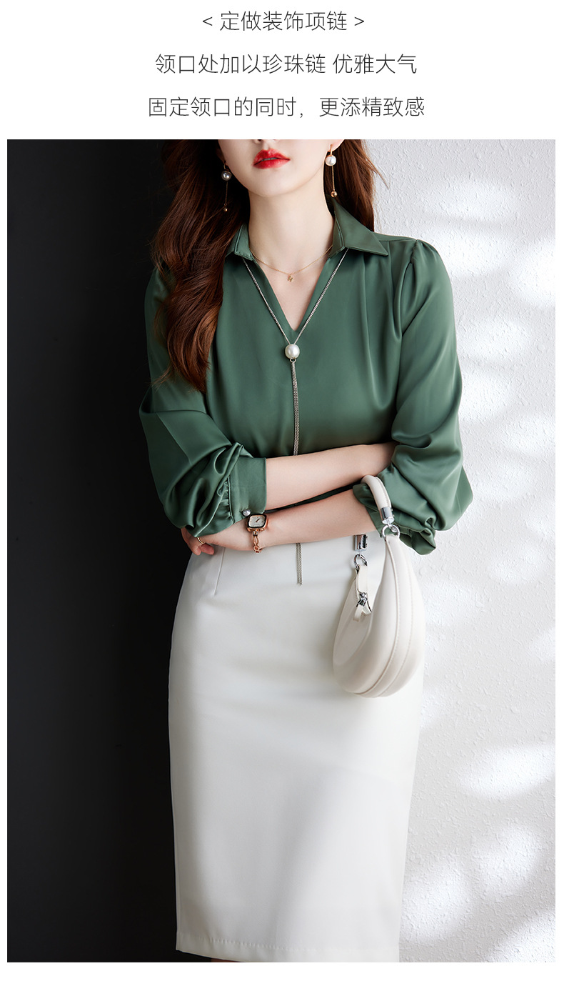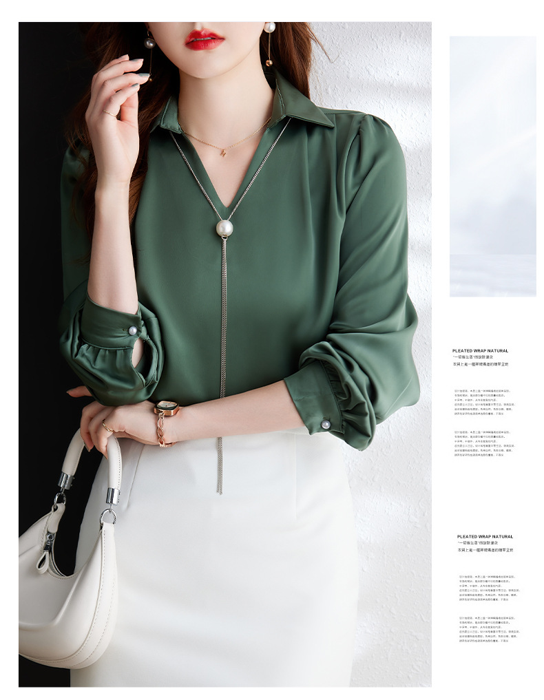 XZ-Q6695设计感项链V领丝绸缎面长袖衬衫女初秋气质真丝打底白衬衫上衣