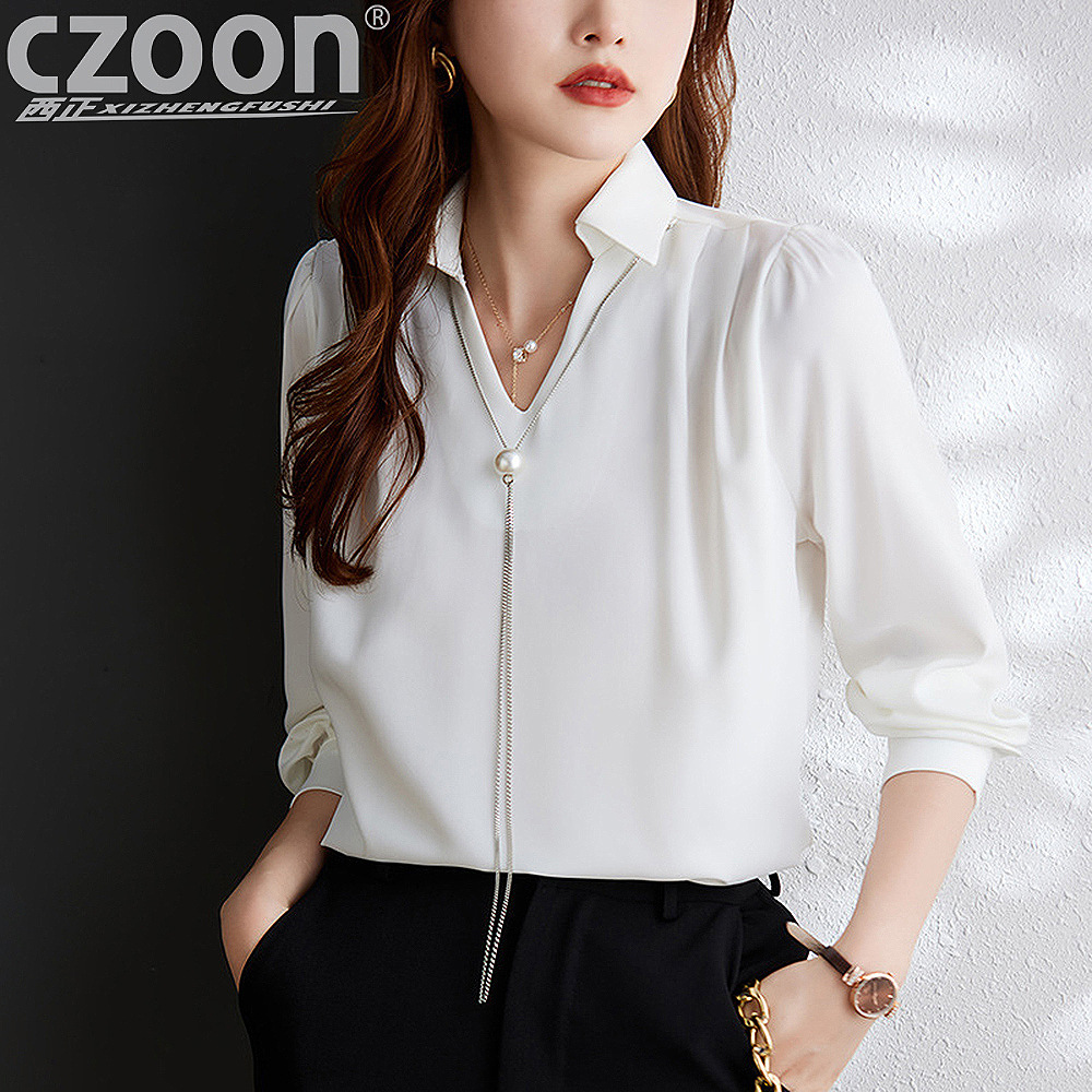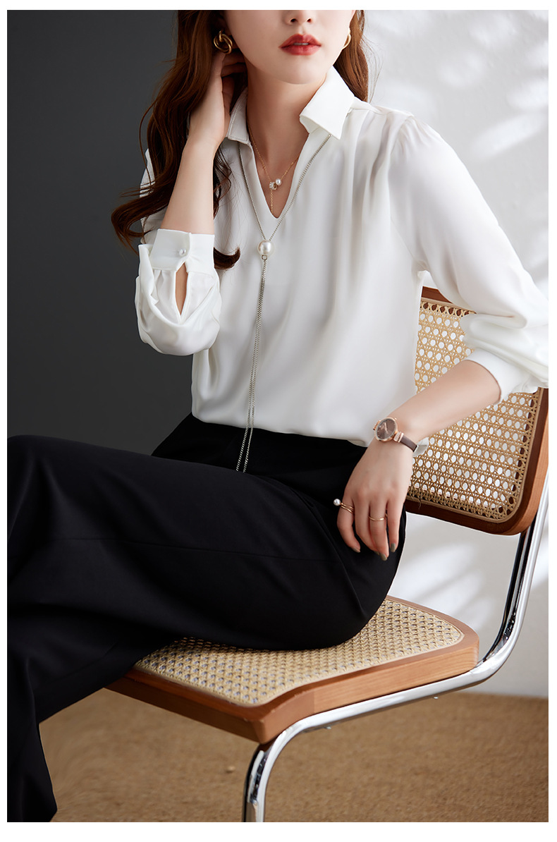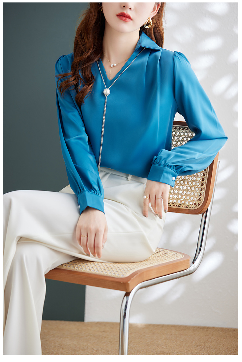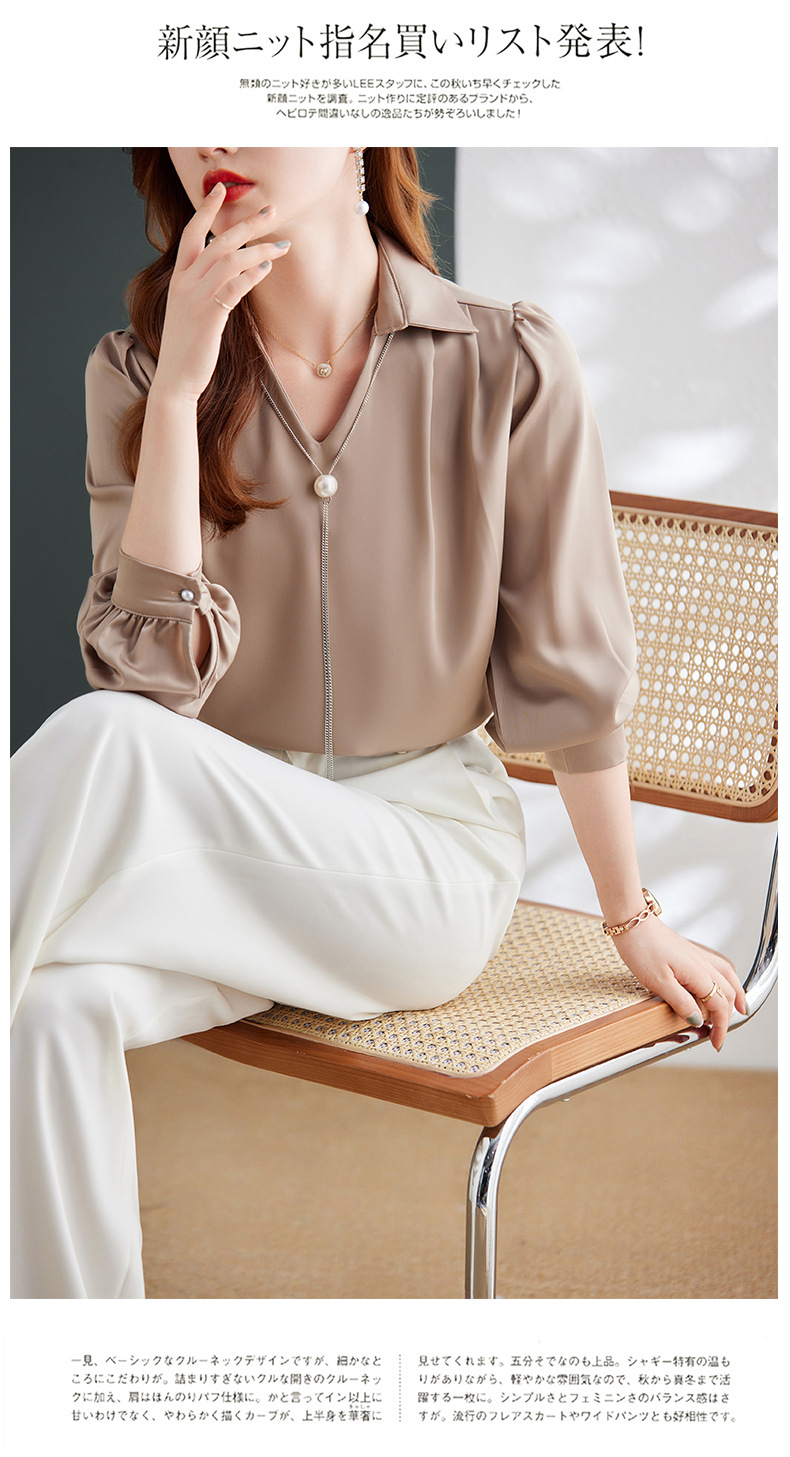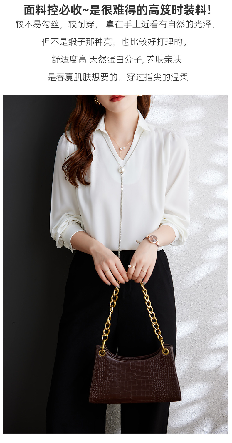 XZ-Q6695设计感项链V领丝绸缎面长袖衬衫女初秋气质真丝打底白衬衫上衣