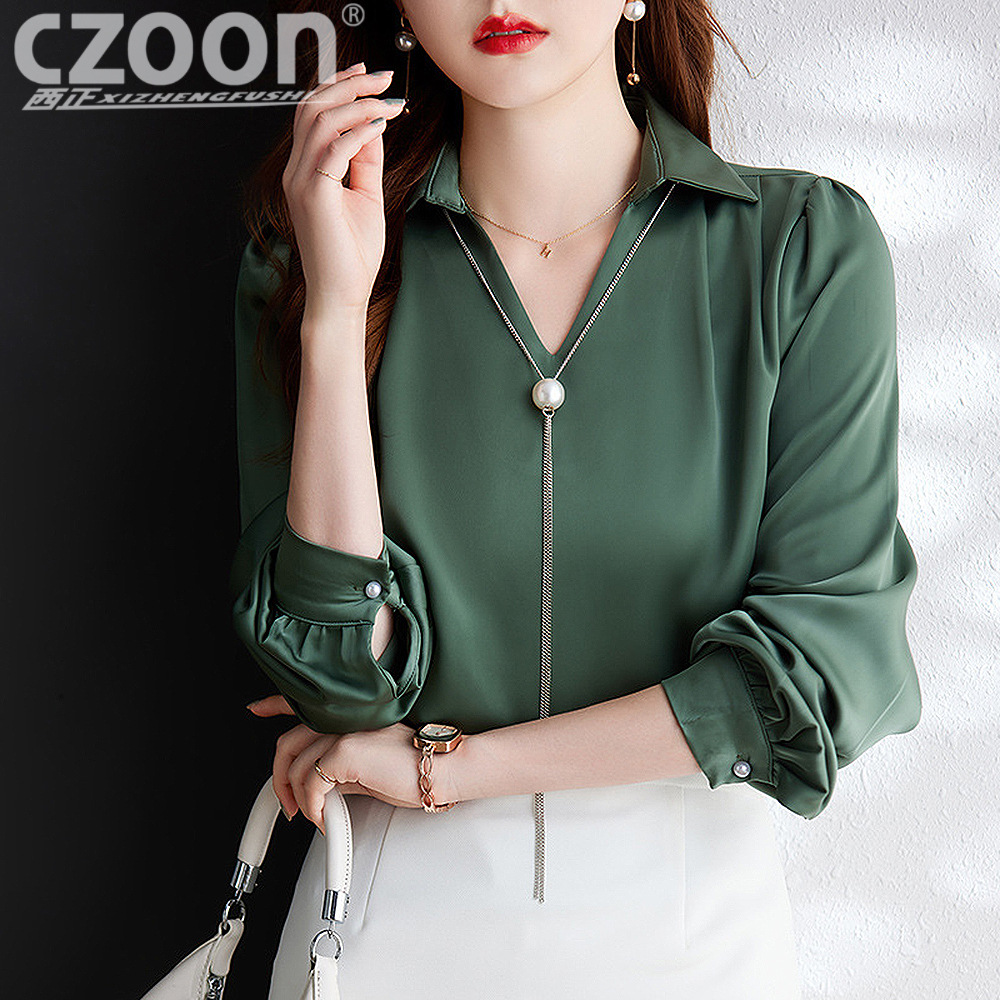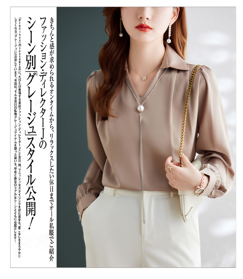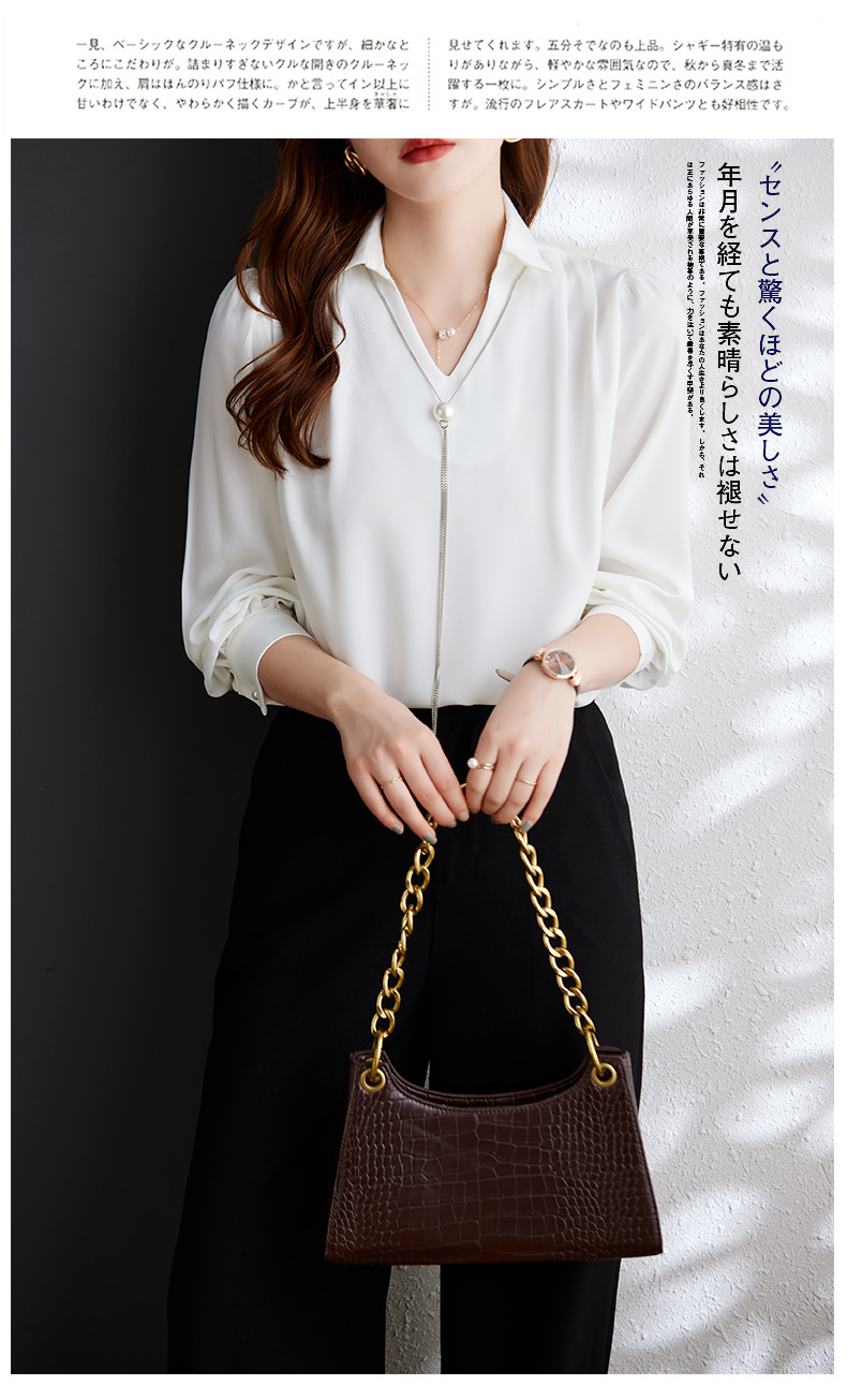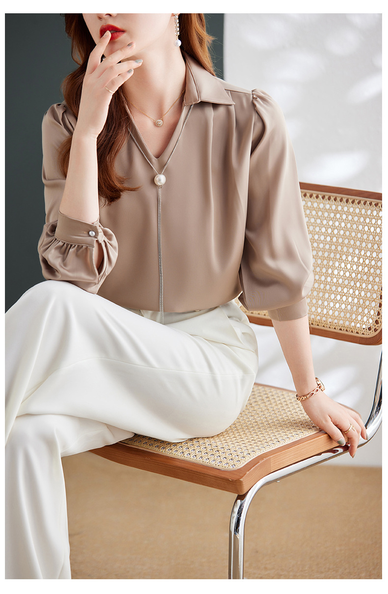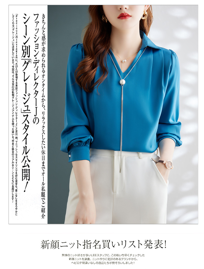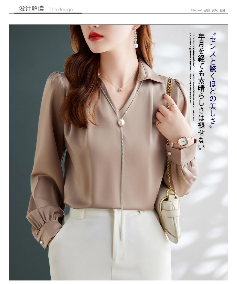 XZ-Q6695设计感项链V领丝绸缎面长袖衬衫女初秋气质真丝打底白衬衫上衣