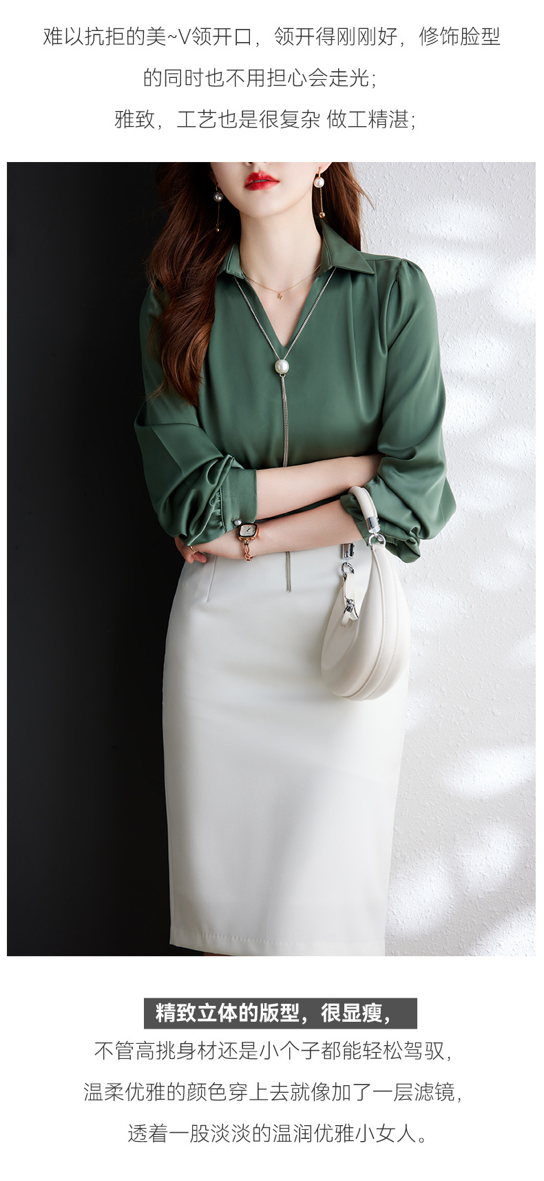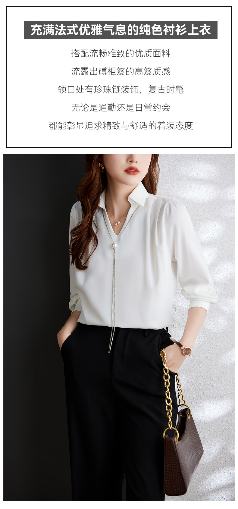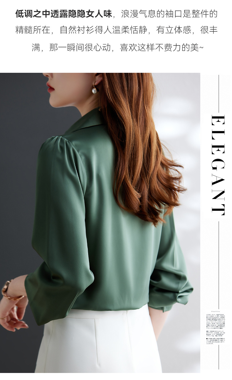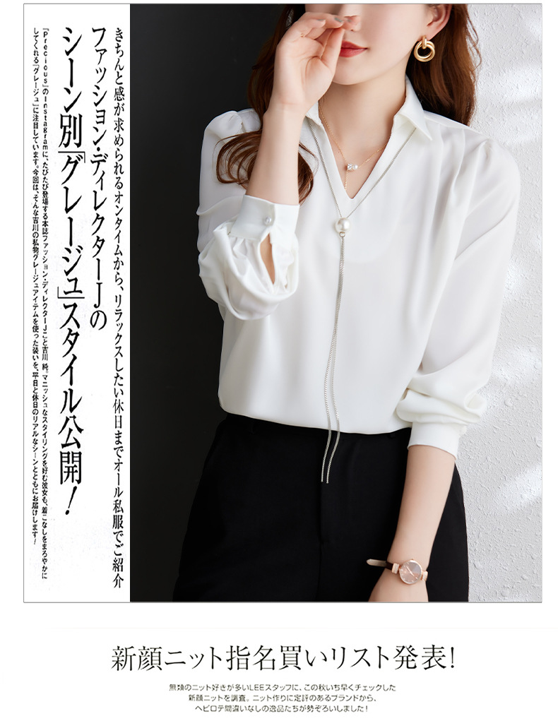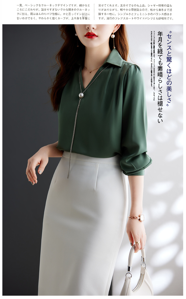XZ-Q6695设计感项链V领丝绸缎面长袖衬衫女初秋气质真丝打底白衬衫上衣