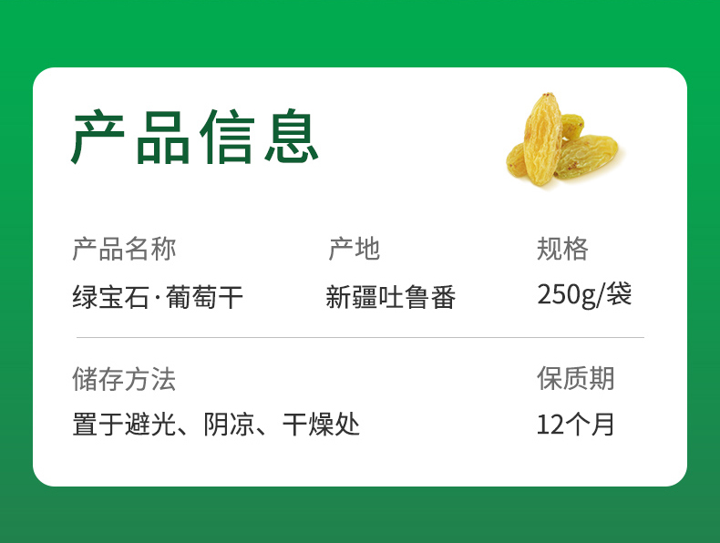 雪莲山·绿宝石葡萄干250g 碧绿晶莹 果粒均匀