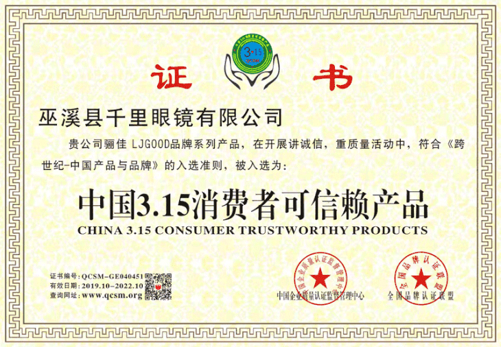 它不仅多次获得“可信赖产品”奖,被评为“质量、服务、诚信3A企业”、“中国眼镜行业畅销品牌”……