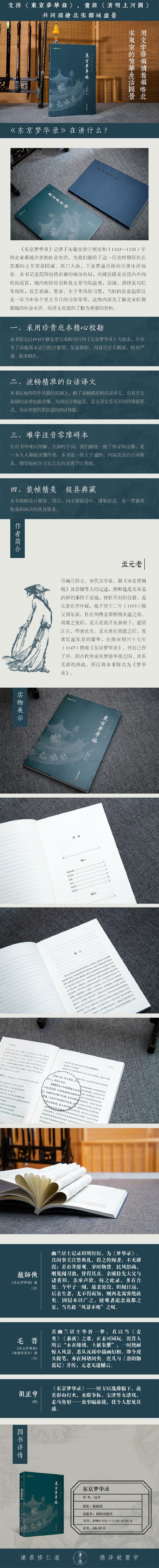该书记述范围包括京都的城市布局,内城宫殿及宫廷内外的机构设置,城内的街坊名称及主要寺院道观,店铺、酒肆及勾栏等场所,伎艺表演、娶亲、生子等风俗习惯,当时的饮食起居以及一年当中各个重大节日的习俗等等。这些内容为了解北宋后期都城的社会生活、经济文化提供了极为重要的资料。