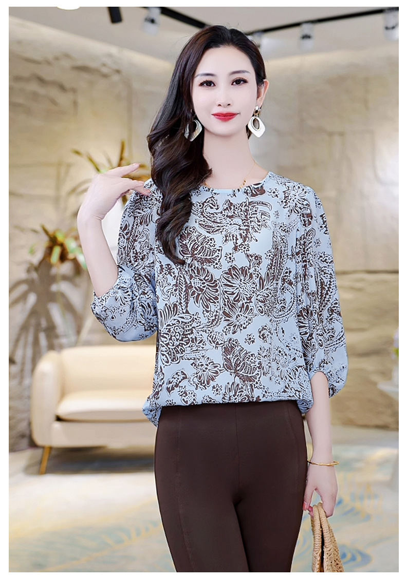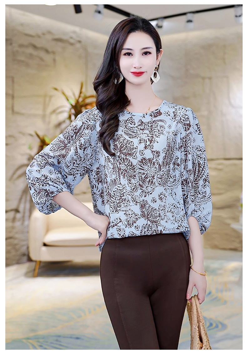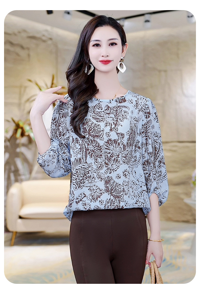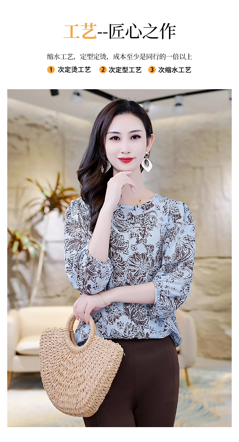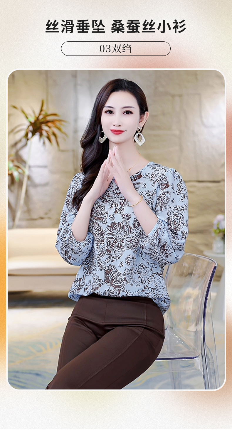 LS-AS0329七分袖双绉真丝上衣女2024年秋装新款印花时尚桑蚕丝气质显瘦上衣