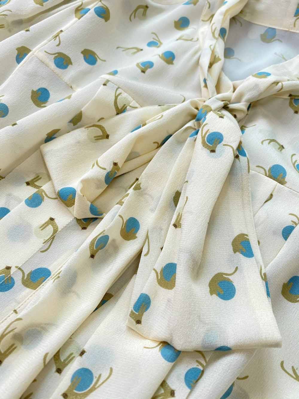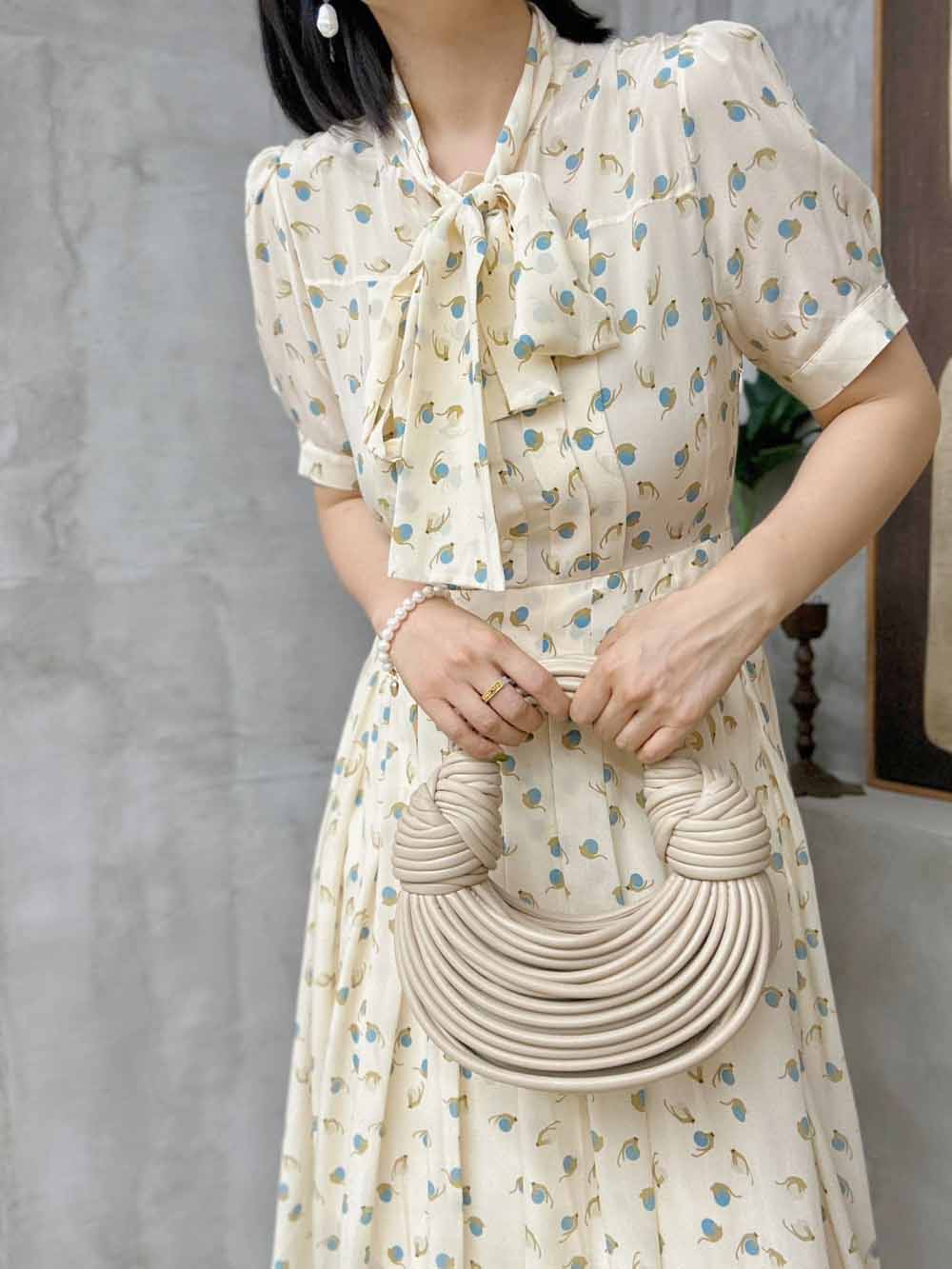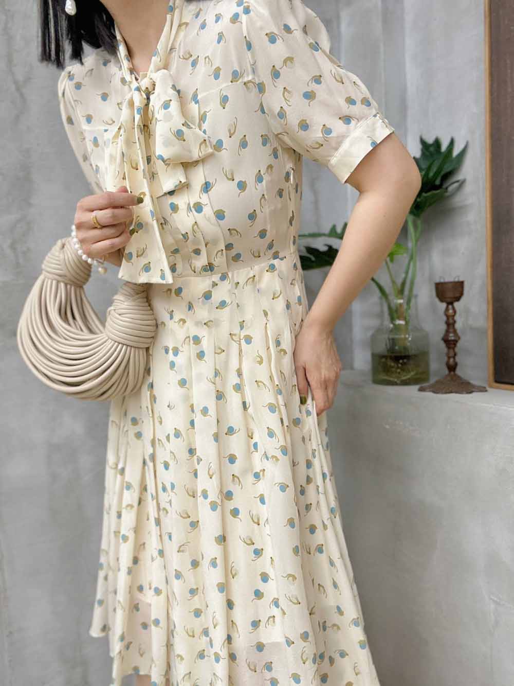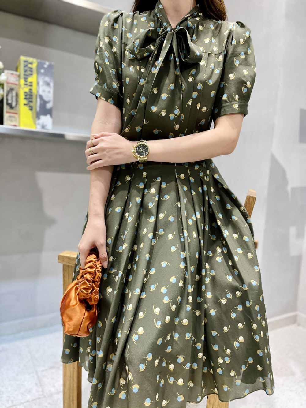 顺丰包邮洛诗琳34802新款蝴蝶结飘带真丝印花百褶连衣裙女53068