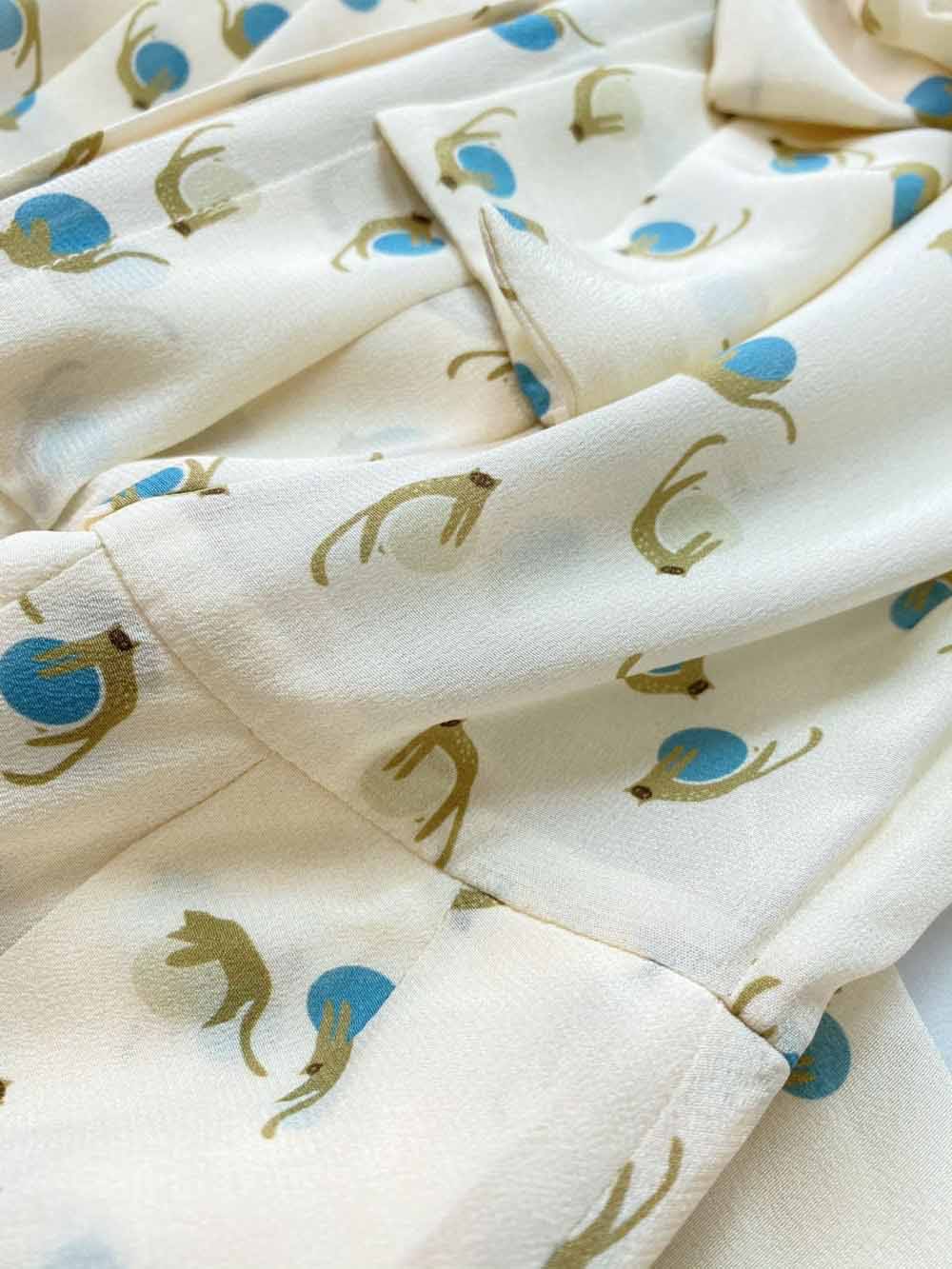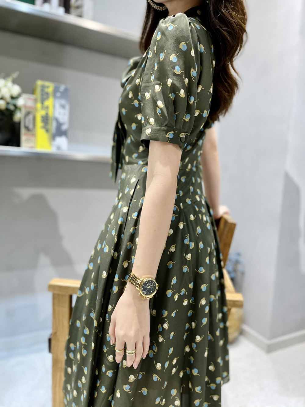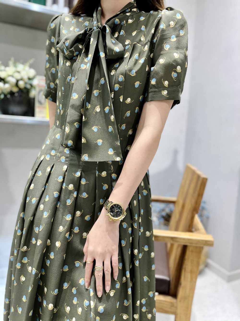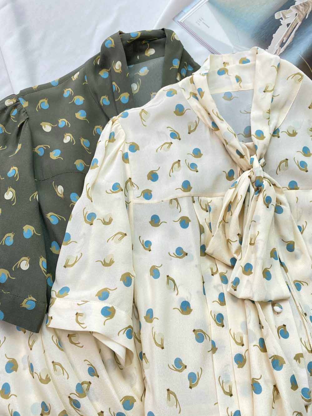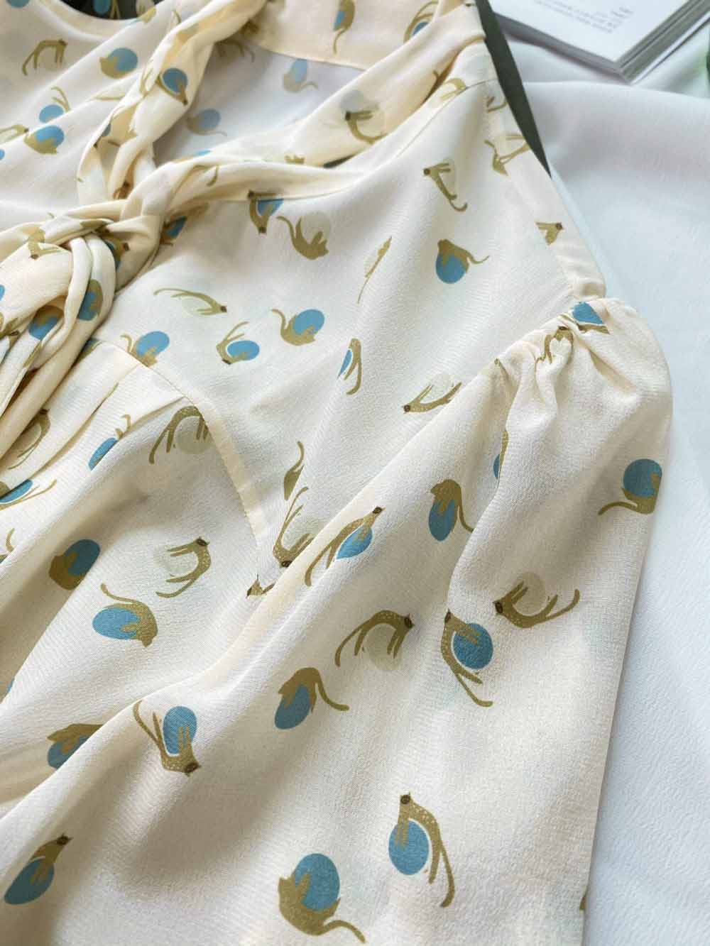 顺丰包邮洛诗琳34802新款蝴蝶结飘带真丝印花百褶连衣裙女53068