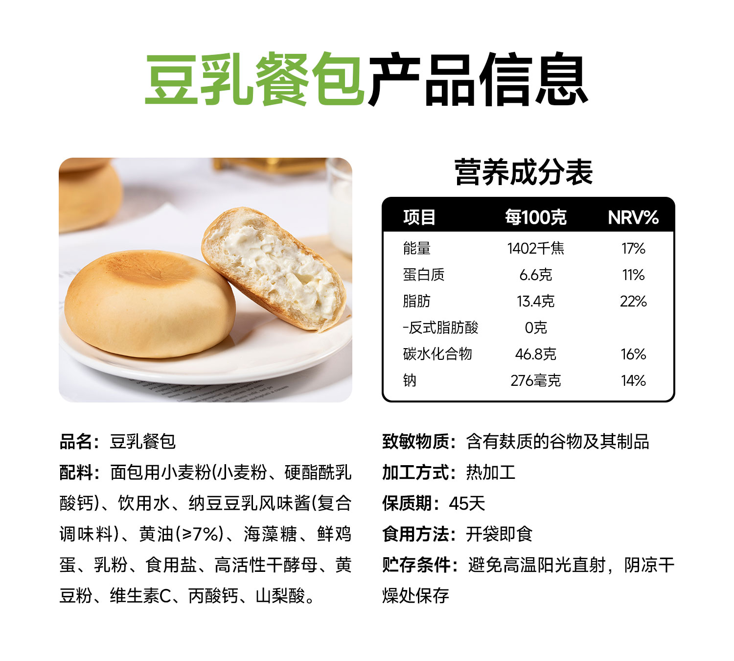【0反式脂肪酸】容意生活纳豆夹心豆乳餐包/面包 新鲜饱腹点心休闲零食 50克/只*10只/20只