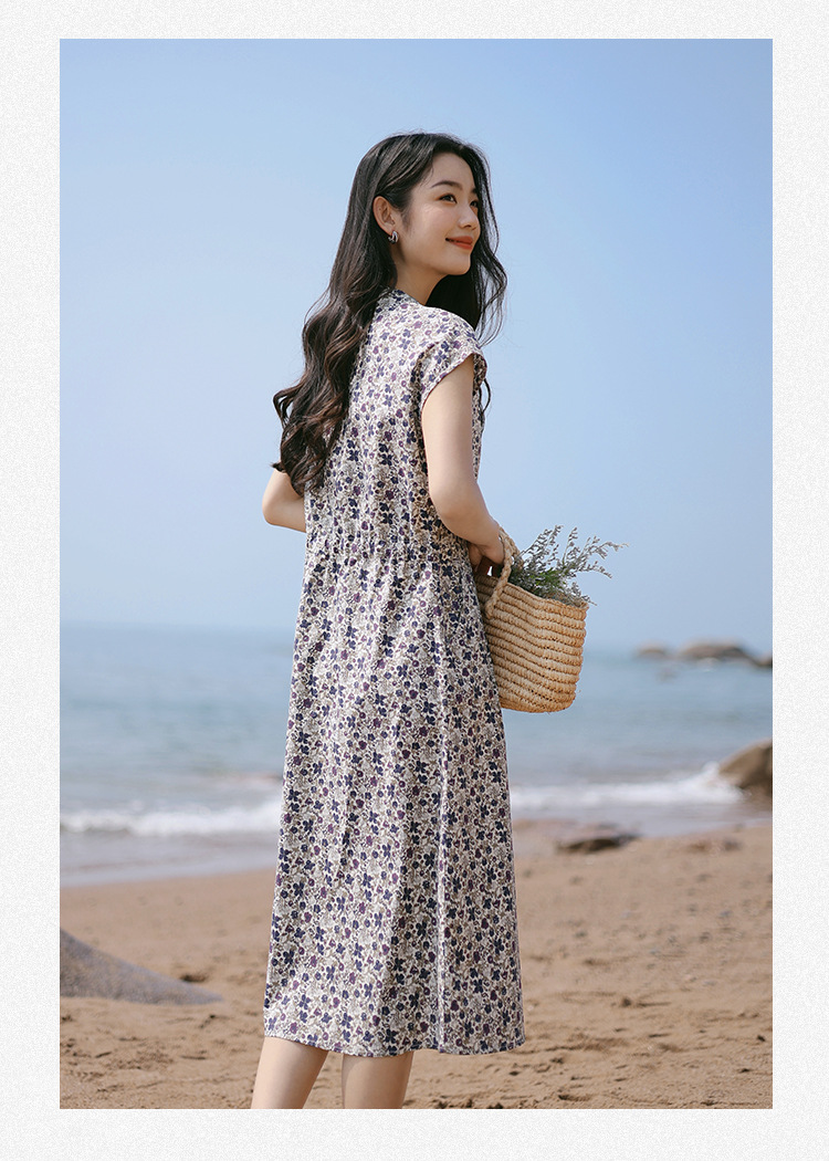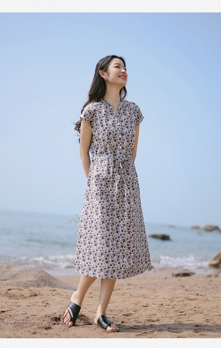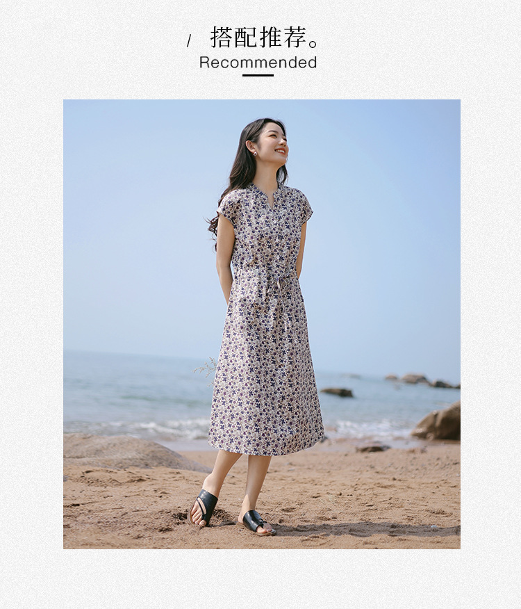 雀说新款短袖碎花连衣裙女夏高级感收腰显瘦系带长裙AL6518