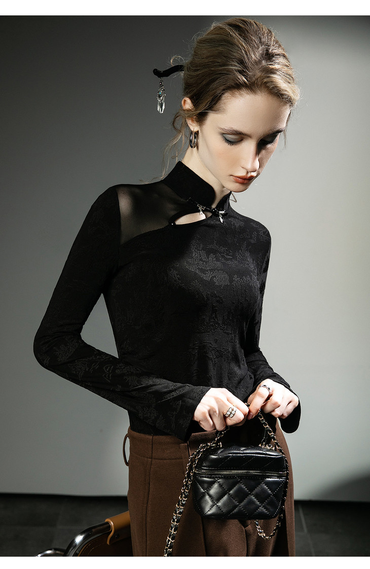 秋冬新款拼接网纱长袖气质修身上衣XD-F20245310 商品图0