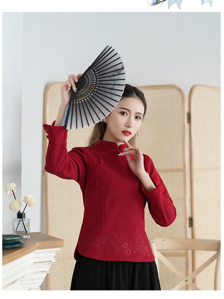 新款加绒加厚民族风斜襟立领上衣 XY2501