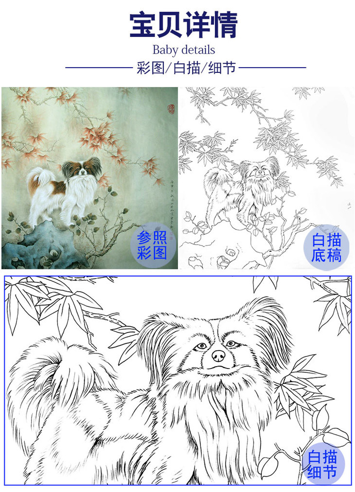 工笔动物白描底稿-李保山-小狗蝴蝶犬-斗方小品册页-多种白描尺寸可选-EL24