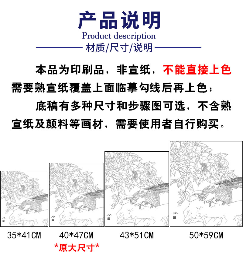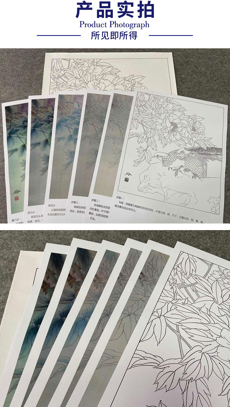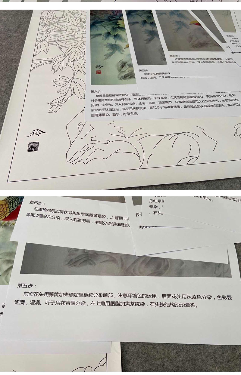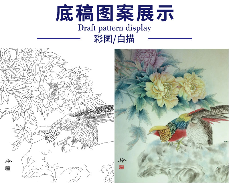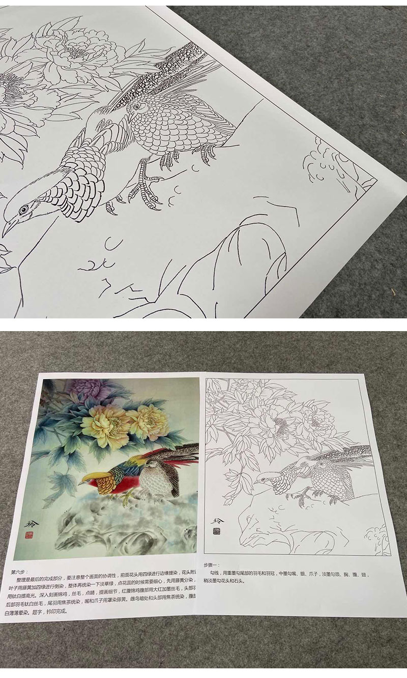 【有步骤、大彩图】郑玲玲工笔画白描稿《锦羽春晖》牡丹锦鸡初学者临摹花鸟线稿ZL54