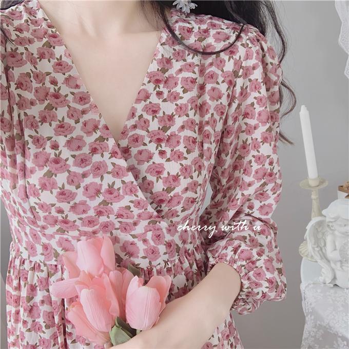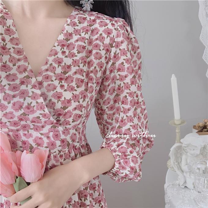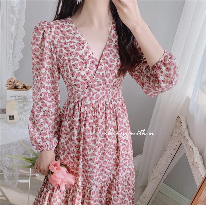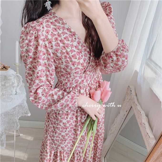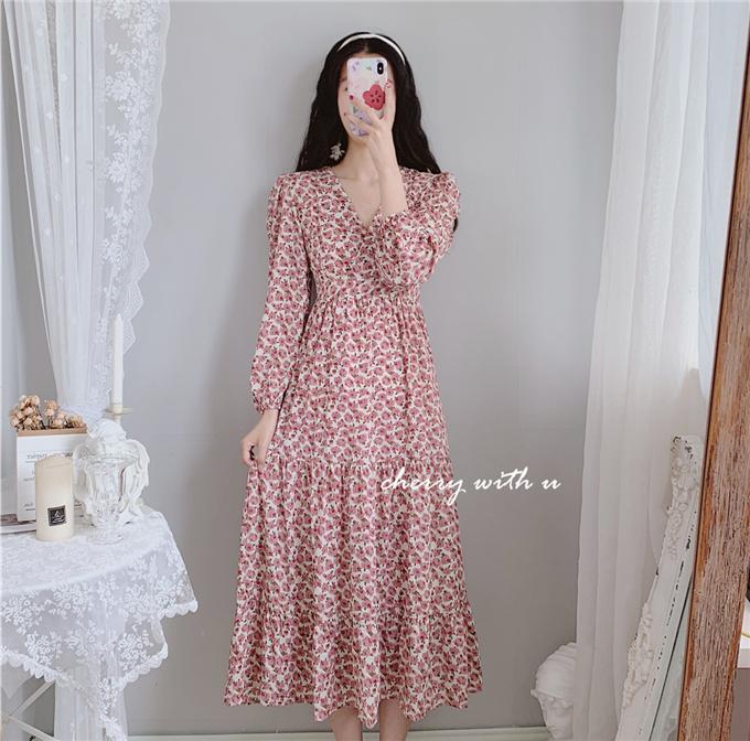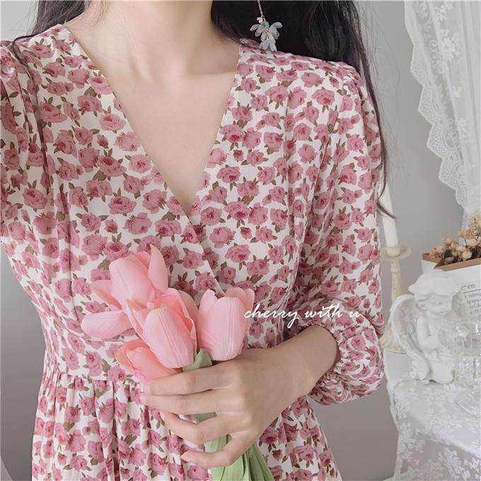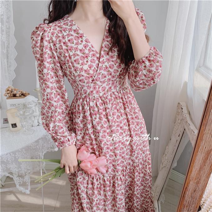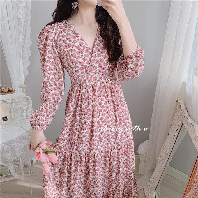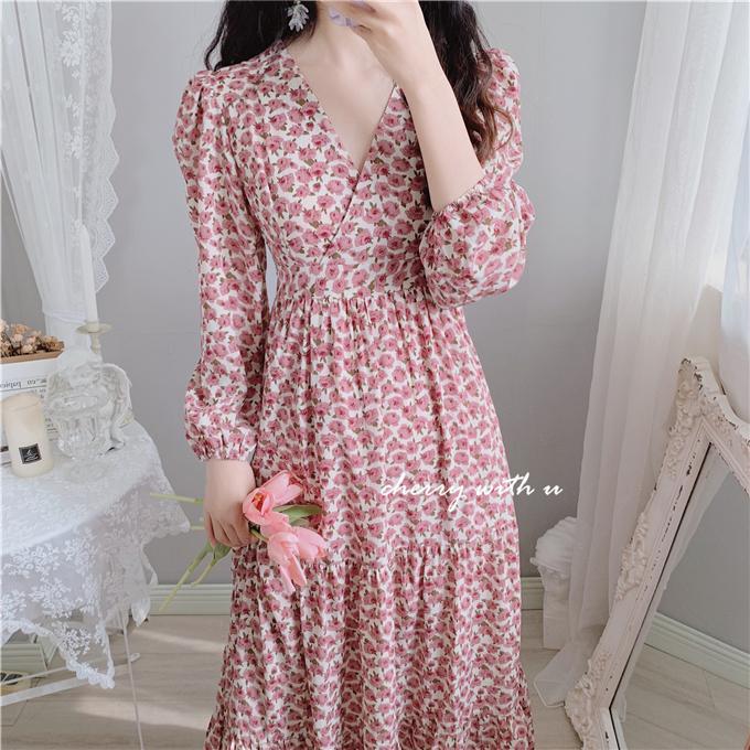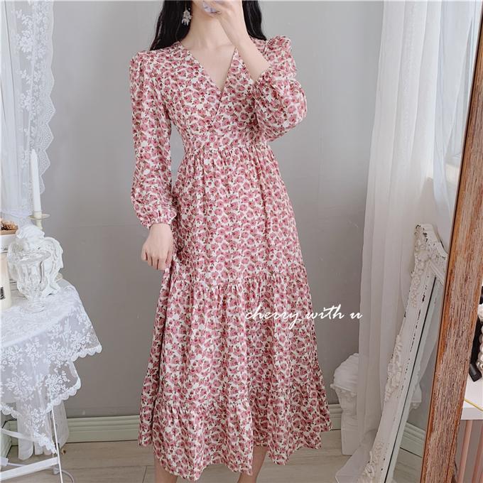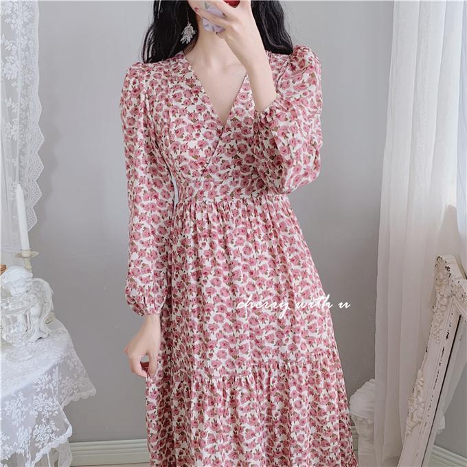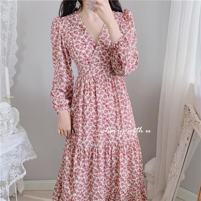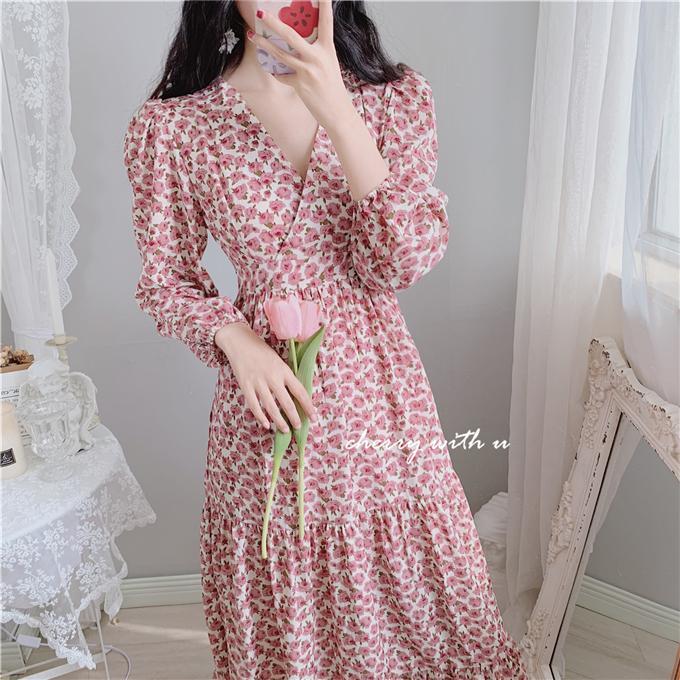 气质显瘦复古粉色花朵高腰V领荷叶边韩版长裙打底裙春秋装印花裙