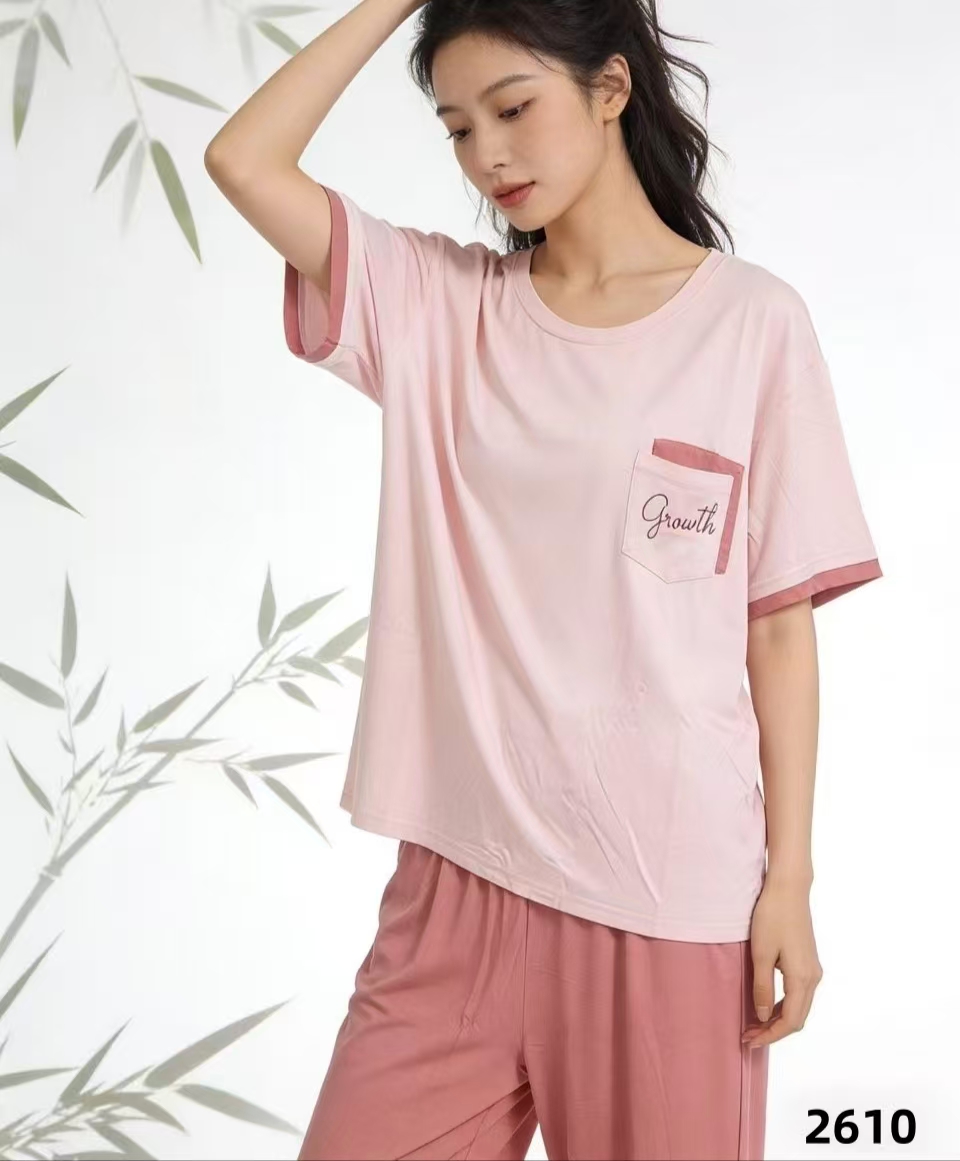 【品名】LS竹纤维女士时尚撞色口袋半袖长款家居套2610