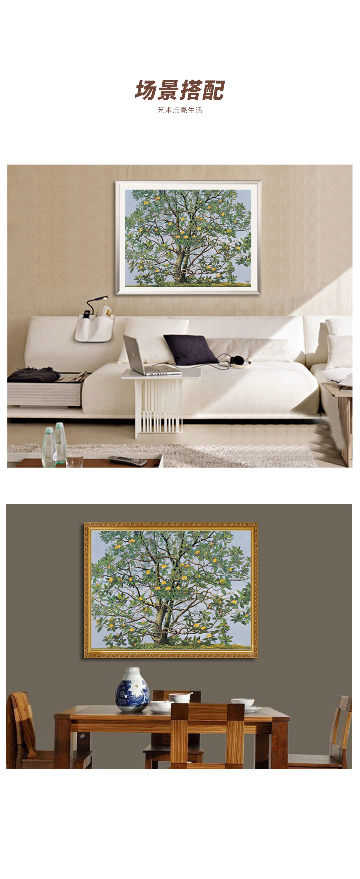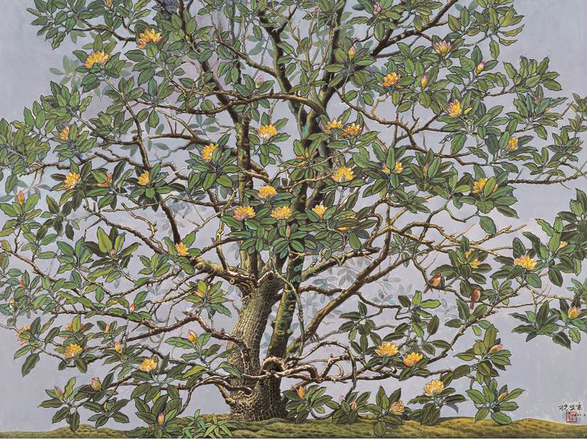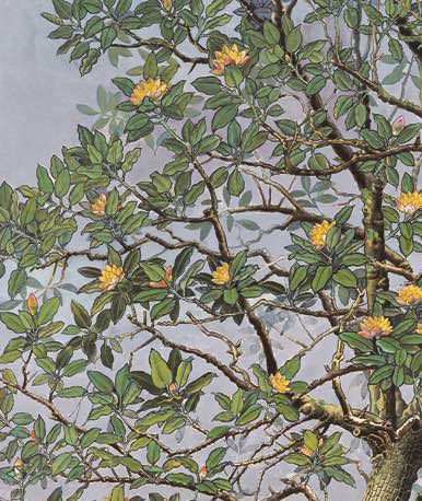 画面饱满厚重,繁花密叶,尽精微而致广大。笔细而气足,精微中见法度,繁密中显空灵,强调博大与精微以及实中求虚、求神,以幻写真。