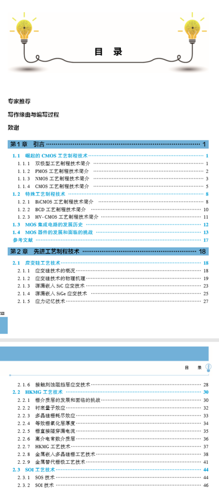 半导体工艺技术涉及面很宽,包括半导体材料、工艺方案、半导体物理及器件理论,甚至还有量子力学理论等。因此要对半导体工艺技术的发展和特点作全面的介绍和比较,有着巨大的挑战性。在《集成电路制造工艺与工程应用》这本书中,作者以其扎实的知识储备和难得的跨领域工作经历为基础,采用独特的视角——从经典的TTL、PMOS、NMOS、CMOS、BiCMOS、BCD等,一直到新的FD-SOI、FinFET等;从亚微米、到深亚微米,一直到先进的纳米——来讲解集成电路工艺技术,循序渐进,深入浅出,很好地铨释了半个多世纪来半导体工艺技术的发展轨迹。在工艺步骤方面配以彩图讲解,也增加了学习的趣味性,增强理解与记忆。正所谓一图胜过千字。除了比较各种工艺技术方案的优劣,作者还总结了各种新的工艺方案所带来的新问题,比如HKMG工艺所增加的SiON层对等效栅极电容的不良影响。这对读者了解今后工艺技术的发展方向很有帮助。