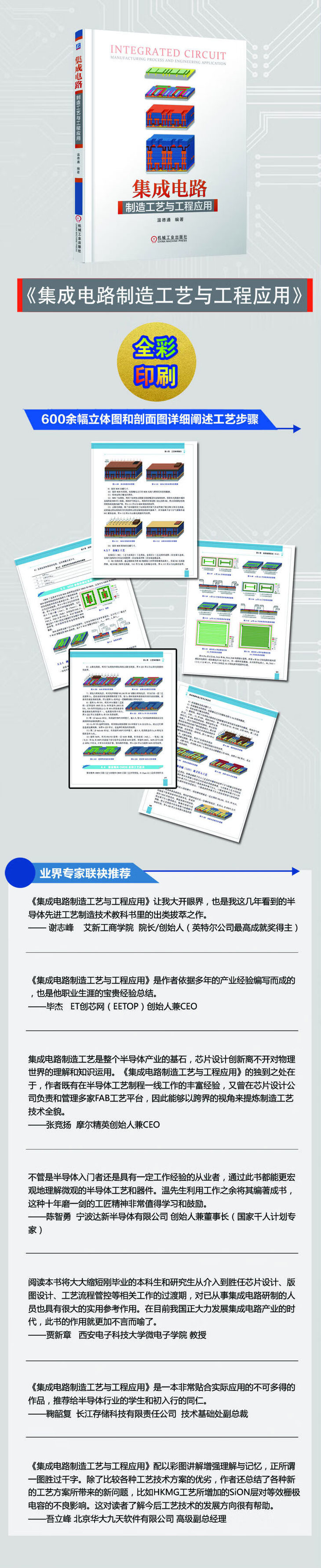 近十几年,我国集成电路产业发展迅速,集成电路工艺技术层出不穷,产业界急需一部对新工艺现状进行全面阐述的书籍,温德通先生结合十余年工作经验的积累,花大量的时间研究分析半导体新工艺,写出了一部基本上覆盖所有半导体新工艺技术,并兼具科普性与专业性的书籍。《集成电路制造工艺与工程应用》一书内容充实丰富,章节合理有序,通过3D彩图等形式将工艺细节直观、形象地展示出来,不管是半导体入门者还是具有一定工作经验的从业者,通过此书都能更宏观地理解微观的半导体工艺和器件。温先生利用工作之余将其编著成书,这种十年磨一剑的工匠精神非常值得学习和鼓励。