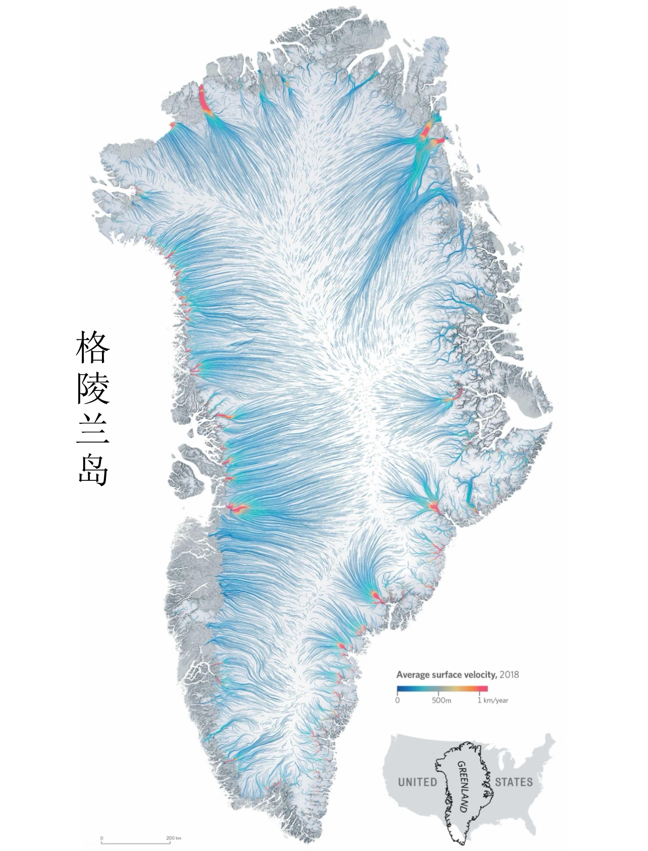 触目惊心的数据刻度:格陵兰冰盖每年减少2870亿吨冰体,冰川退缩速度比2000年快7倍,海平面上升有25%来自格陵兰融冰,本世纪末冰盖全部消失将导致海平面上升7.4米。