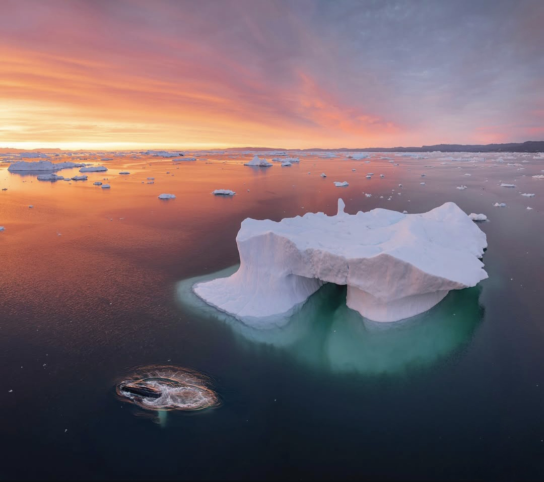 清晨在观赏鲸鱼的圣地的迪斯科湾展开寻鲸拍摄。湛蓝海面上常可见座头鲸优雅跃出水面的身影。若幸运亲眼目睹牠们捕食时那震撼人心的场景——鲸尾掀起的浪花与极地阳光交织成一幕令人难忘的自然奇观。