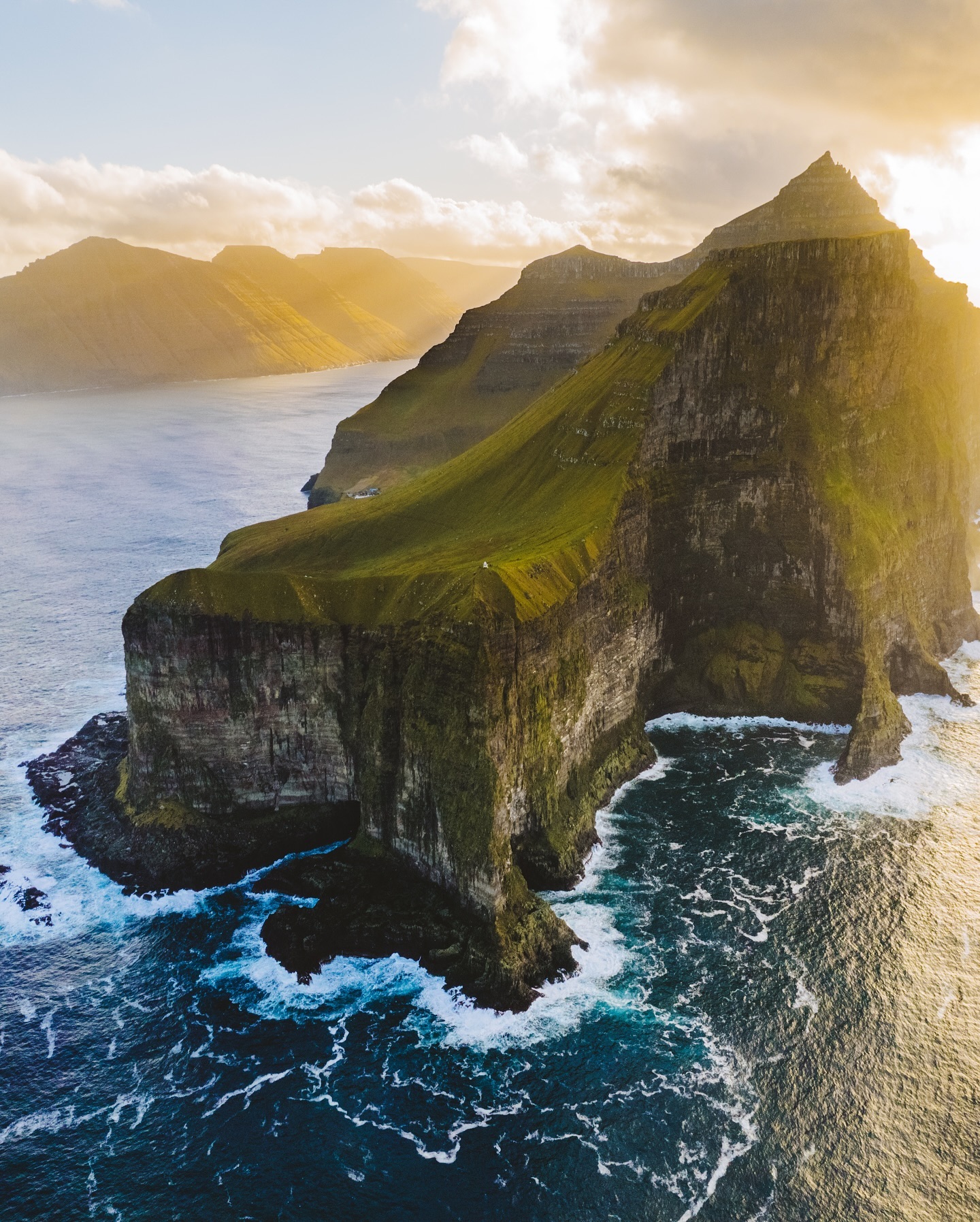 瓦加尔岛拍摄,法罗群岛最后一个通车的小镇Gásadalur,拍摄著名穆拉法索尔瀑布是法罗群岛的“网红景点”,称为“海上悬湖”瀑布飞流直下,融入大西洋又名入海瀑布。海上悬湖的湖滨与周围巍峨的海岸悬崖交相辉映,湖水仿佛悬浮在海面之上,神秘的博尔村拍摄。 海蚀拱门达兰加尔门和廷德霍尔穆尔岛拍摄日落和蓝调照片。