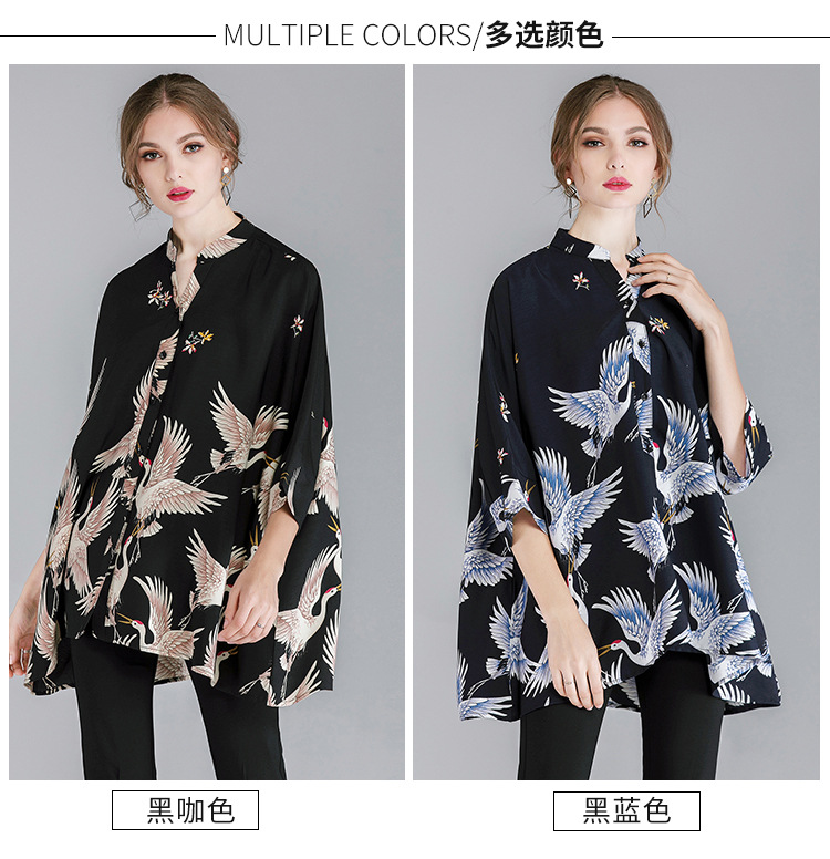 CTH-7113胖mm大码女新款上衣仙鹤印花宽松200斤大码衬衫