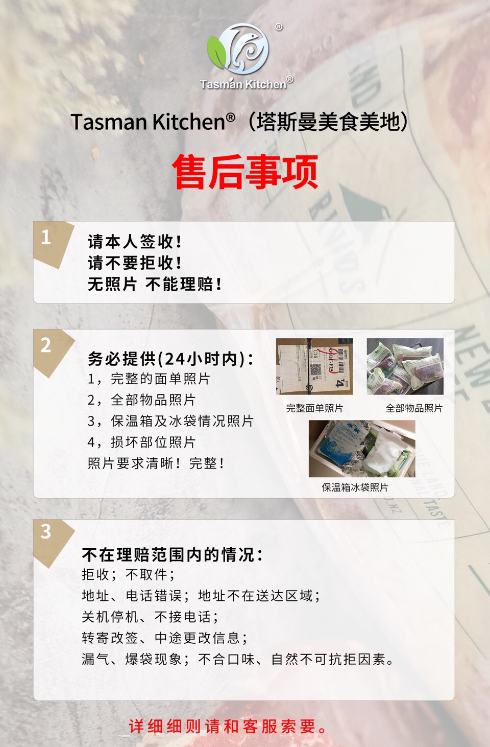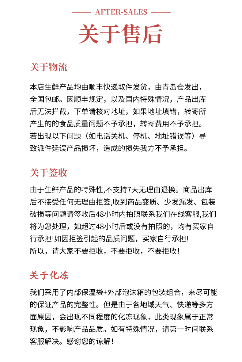【售后说明】:生鲜产品不支持7天无理由退换货,拒签不售后,不支持改地址电话,下单请核对好信息;顾客原因导致产品变质不售后,产品如有问题24小时内拍照反馈(面单照片1张,产品照片1张),生鲜产品到货可能会有些许融化,属于正常现象不在售后范围。由于个人原因提货不及时所造成的售后问题不予处理。