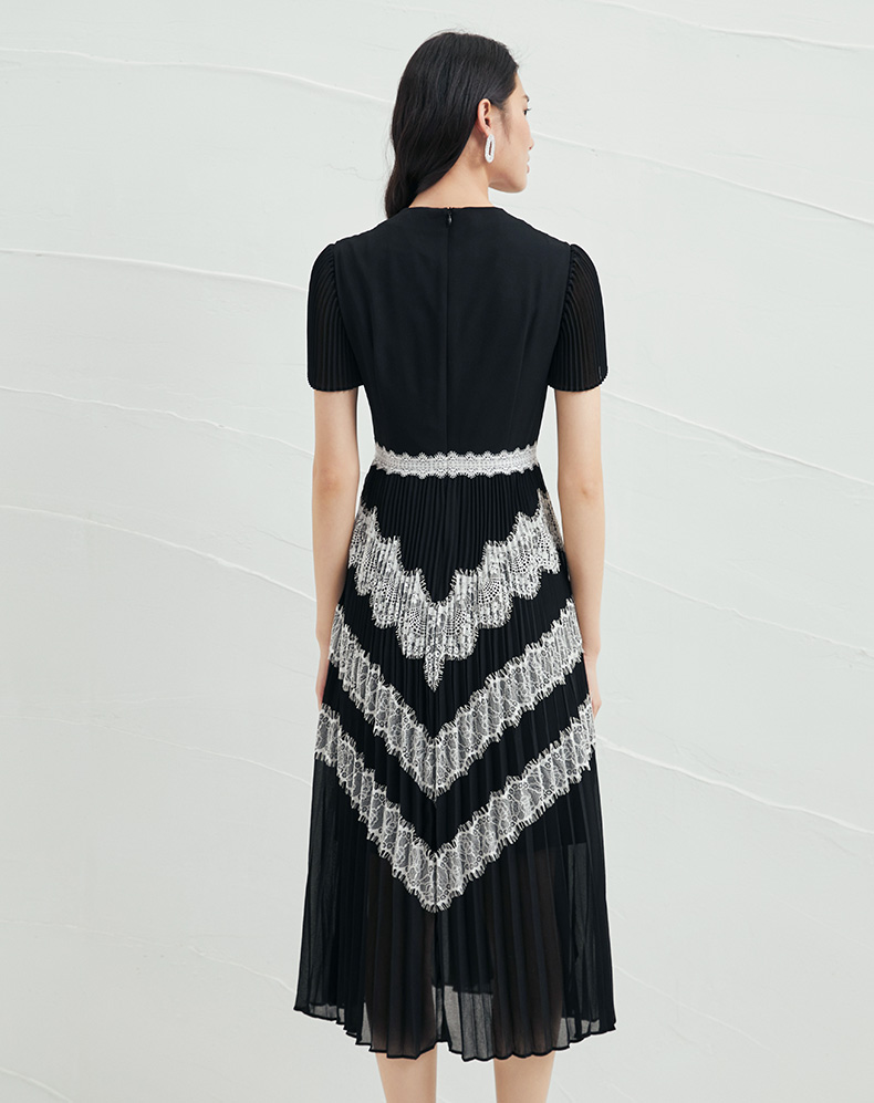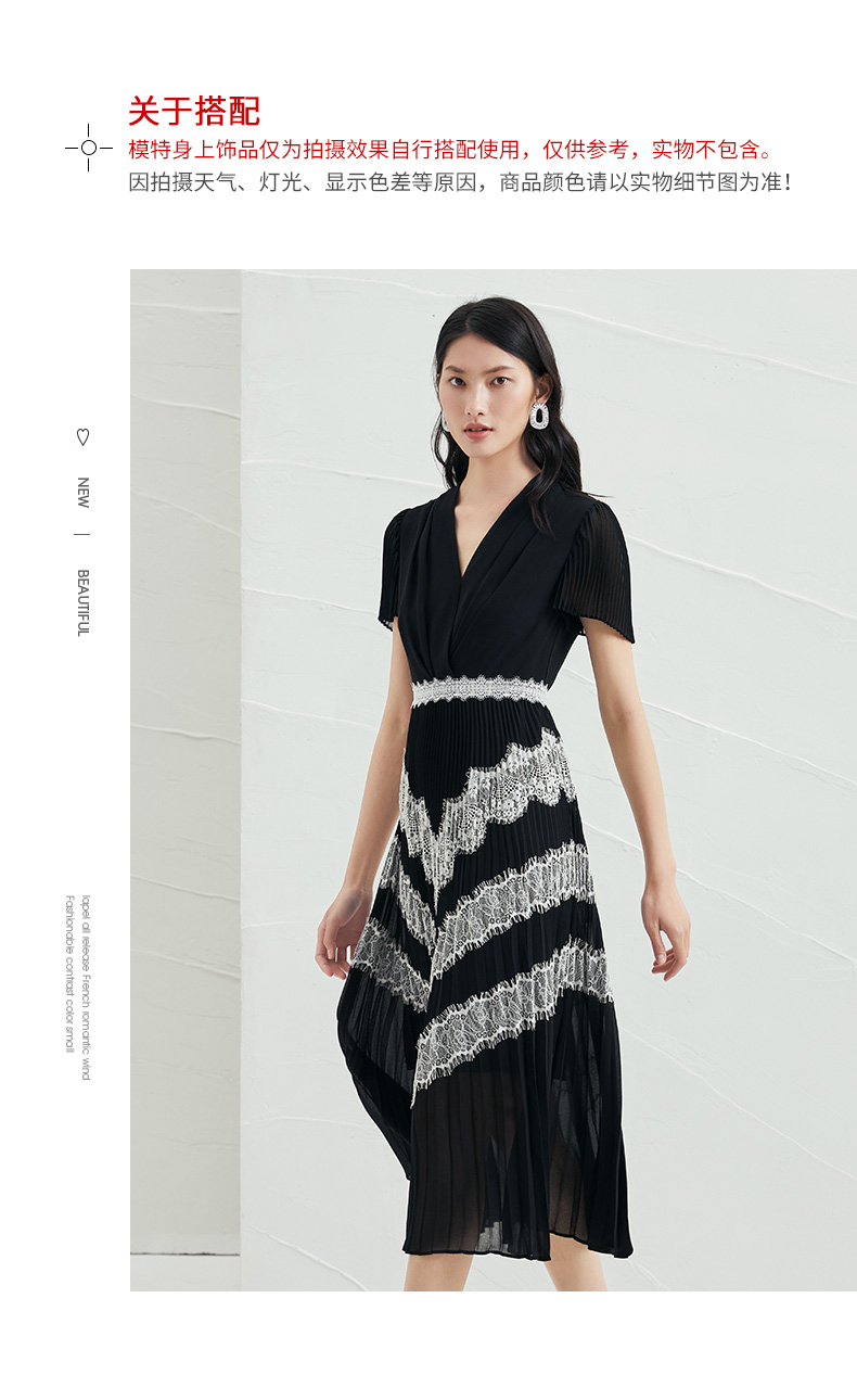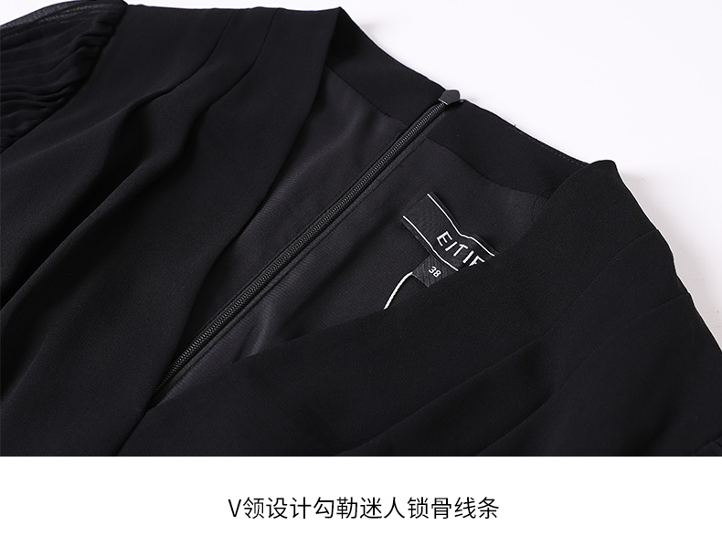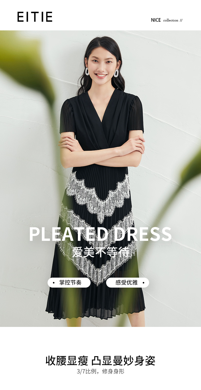 EITIE爱特爱春季新款复古气质洋气V领收腰泡泡袖显瘦连衣裙女A2107711