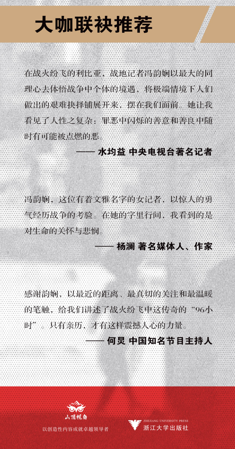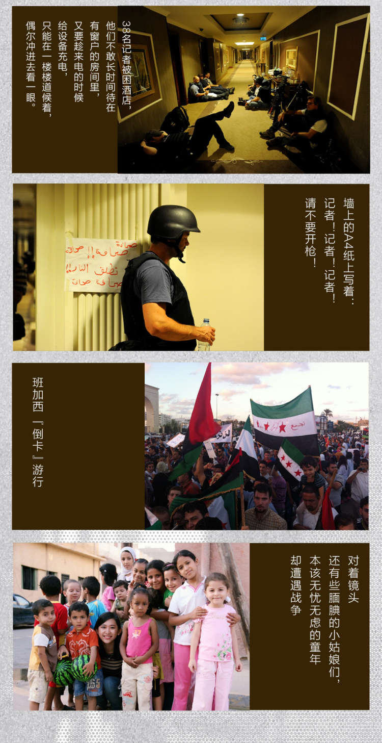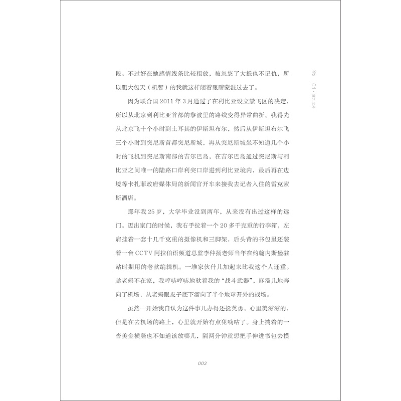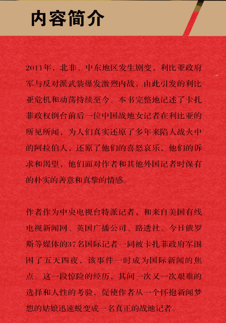 作者作为中央电视台特派记者,和来自美国有线电视新闻网、英国广播公司、路透社、今日俄罗斯等媒体的37名国际记者一同被卡扎菲政府军围困了五天四夜,该事件一时成为国际新闻的焦点。这一段惊险的经历,其间一次又一次艰难的选择和人性的考验,促使作者从一个怀抱新闻梦想的姑娘迅速蜕变成一名真正的战地记者。