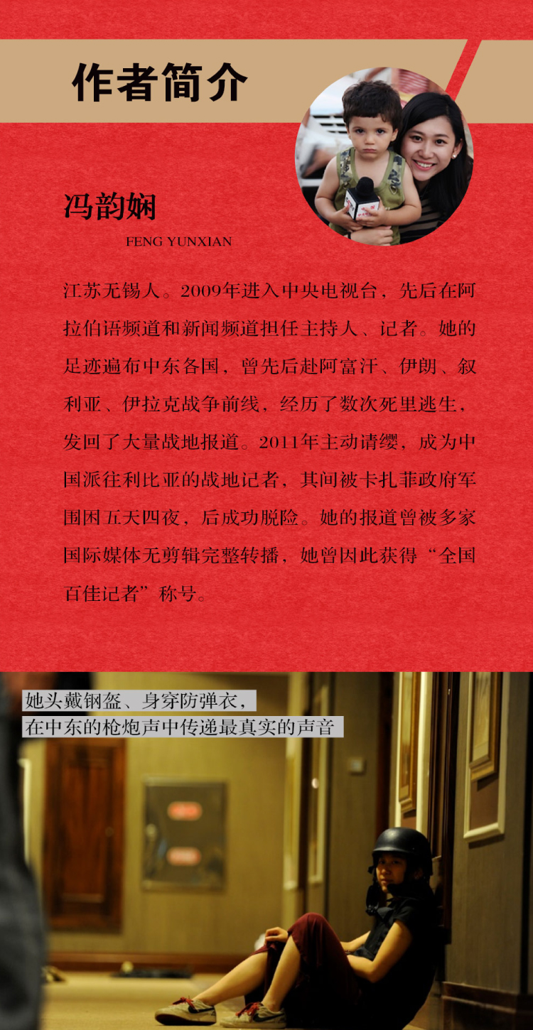 冯韵娴,江苏无锡人。2009年进入中央电视台,先后在阿拉伯语频道和新闻频道担任主持人、记者。她的足迹遍布中东各国,曾先后赴阿富汗、伊朗、叙利亚、伊拉克战争前线,经历了数次死里逃生,发回了大量战地报道。2011年主动请缨,成为中国派往利比亚的战地记者,其间被卡扎菲政府军围困五天四夜,后成功脱险。她的报道曾被多家国际媒体无剪辑完整转播,她曾因此获得“全国百佳记者”称号。